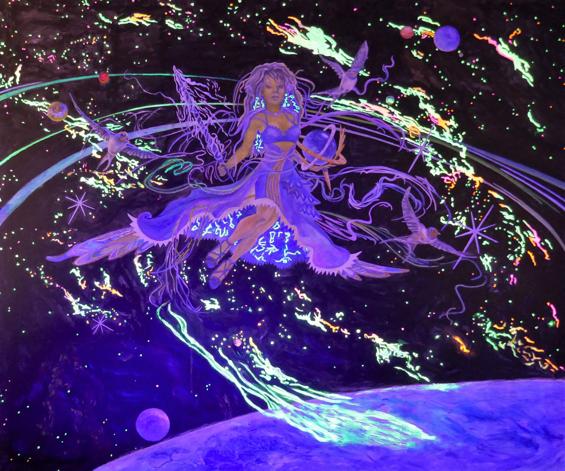 For the exhibition "Light of Other Worlds," Jule Jeursissen drew inspiration from the medium of light, with a particular focus on blacklight. Light creates atmosphere, creates warmth and cold, exposes the hidden, and influences our emotions. Blacklight is a special form of light that makes visible wavelengths normally hidden from us. It also obscures wavelengths normally visible to the human eye. This allows the artist to experiment, to reveal something hidden.
