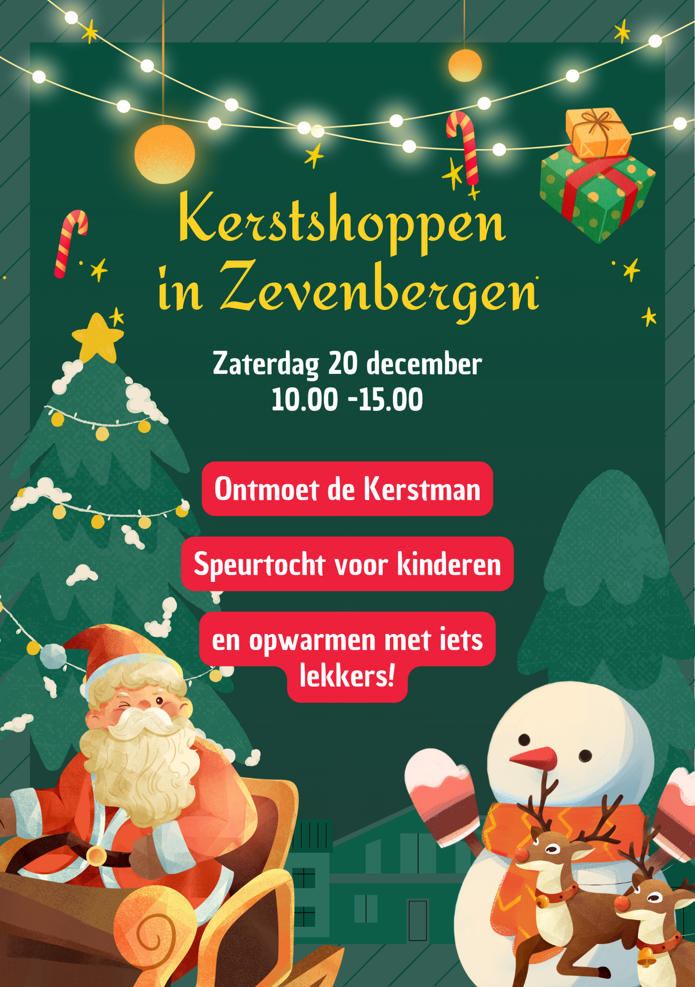 Kom jij zaterdag 20 december kerstshoppen in Zevenbergen. We hebben van 10.00 - 15.00 leuke activiteiten in het centrum. Ga op de foto met de Kerstman, drink samen een glaasje alcoholvrije Glühwein of chocolademelk en tijdens het shoppen vermaken de kinderen zich met een speurtocht.