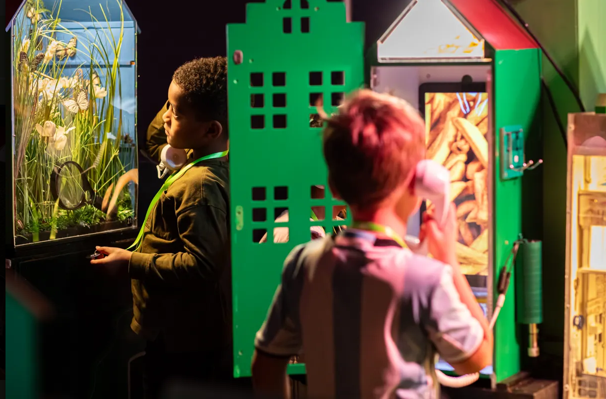 Bovenkamers, geïnspireerd op het Handboek Luchtkastelen Bouwen Voor Kinderen van Barbara Tammes, is een wereld vol verwondering. Waar de fantasie de vrije loop krijgt en je dromen tastbaar worden. Zodra je op je sokken de tent binnenstapt, kom je in een magische miniatuurstad van 35 poppenhuizen vol kamers. Een fantasierijke wereld vol kijkdozen, diorama’s, animaties en stop-motions. Deze installatie is het begin van alles wat je zelf bedenkt en voor altijd met je meedraagt.
