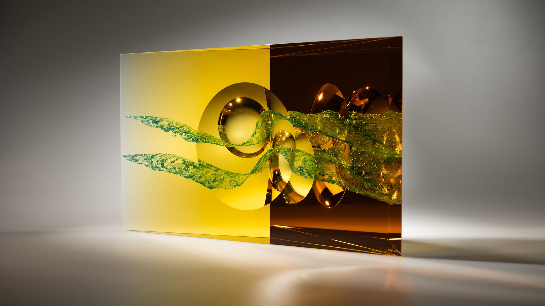 Andrej Jakab (1950) zoekt in zijn ontwikkeling naar inhoud van het van nature optische inhoudloze glas. Hij voegt aan het smetteloze materiaal oneigenlijke elementen toe. In veelal strakke vormen worden kleurnuances aangebracht door metaalpoeders toe te voegen en in te smelten. Na het slijpen en polijsten ontstaat in het object een wonderlijk spel van kleurschakeringen als het licht zich door het spectrum wentelt.