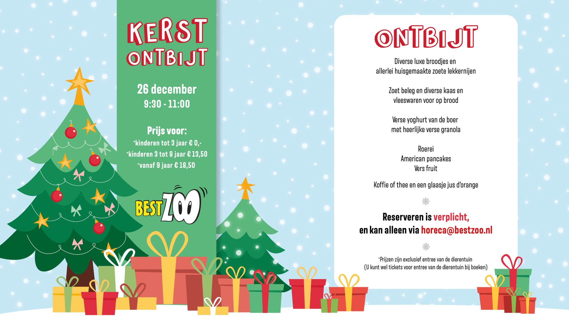 Kom genieten van een heerlijk Kerstontbijt op 26 december bij BestZoo. Reserveren kan vanaf nu op horeca@bestzoo.nl