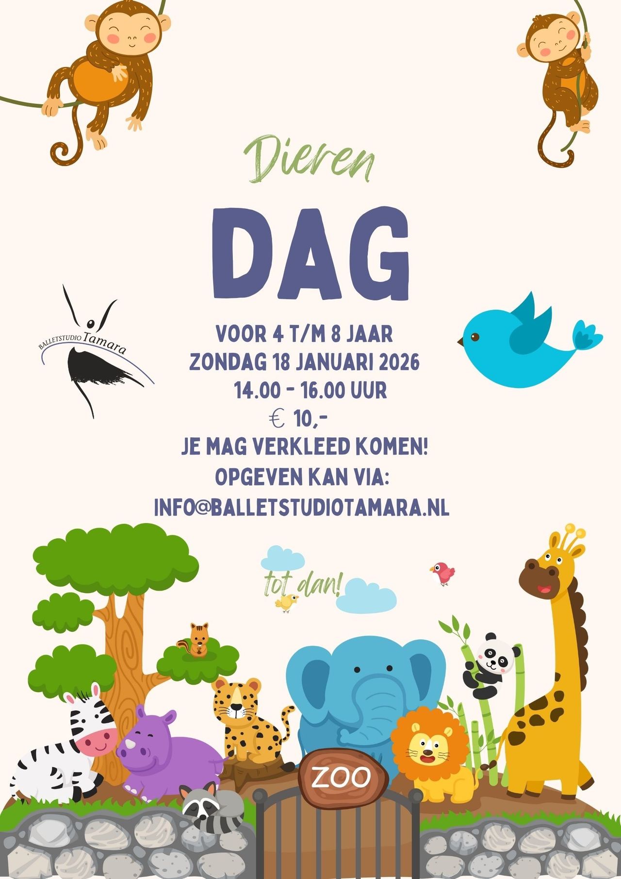 Balletstudio Tamara organiseert een leuke middag vol met dans, spelletjes en knutselen voor kinderen van 4 t/m 8 jaar met als thema dieren. 14.00-16.00uur,