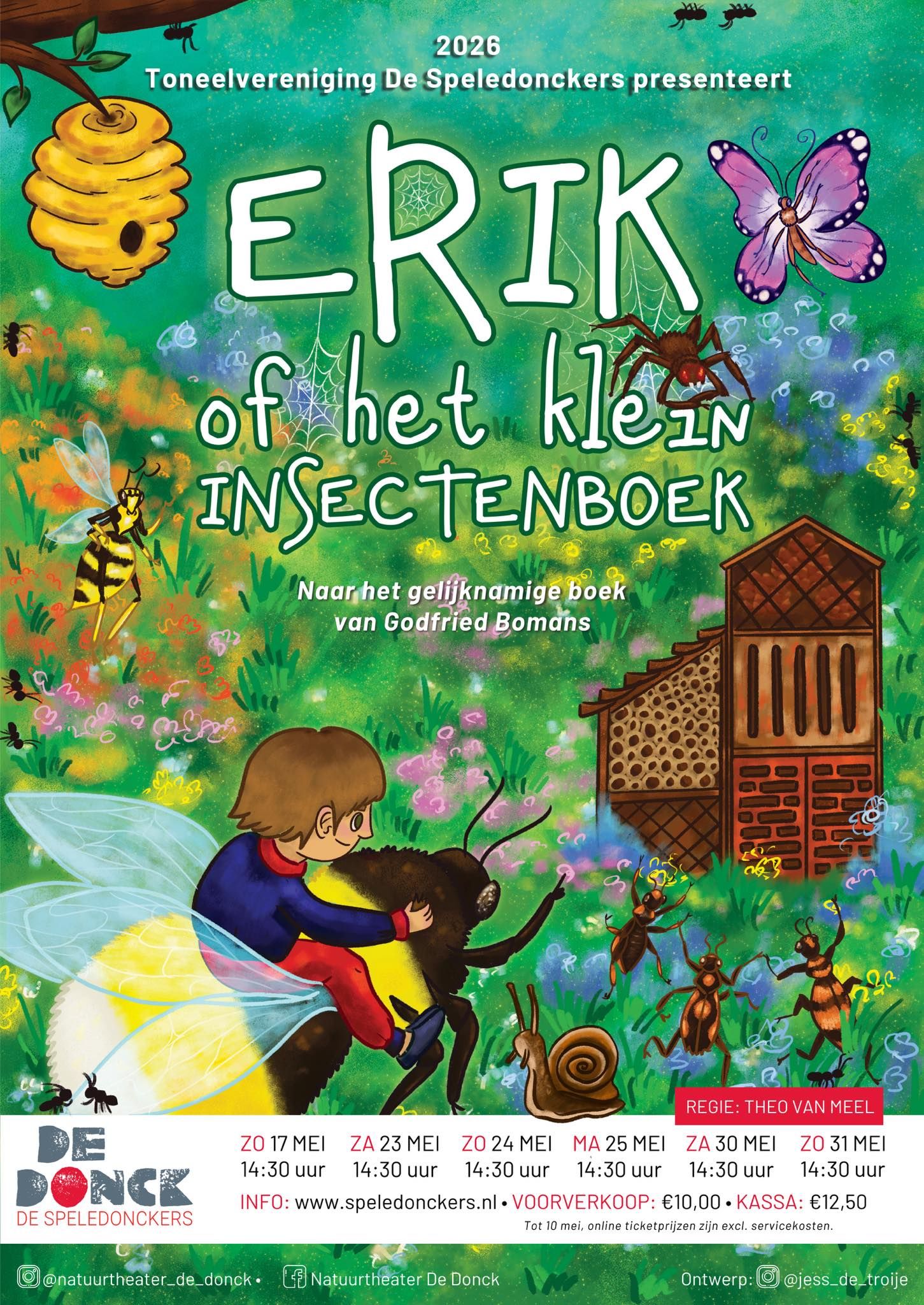 Toneelvereniging De Speledonckers presenteert Erik of het klein insectenboek, vanaf 17 mei 2026 te zien in natuurtheater De Donck in Someren.