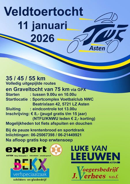 Vertrek 09.00 uur van de routes bij Sportcomplex NWC. Deelname € 8.00 . Pauze krentenbrood en sportdrank. Na afloop kop erwtensoep. Adres: Voetbalclub NWC | Beatrixlaan 42, 5721 LZ Asten. Contact: www.twcasten.nl | 06-25067398 | info@twcasten.nl