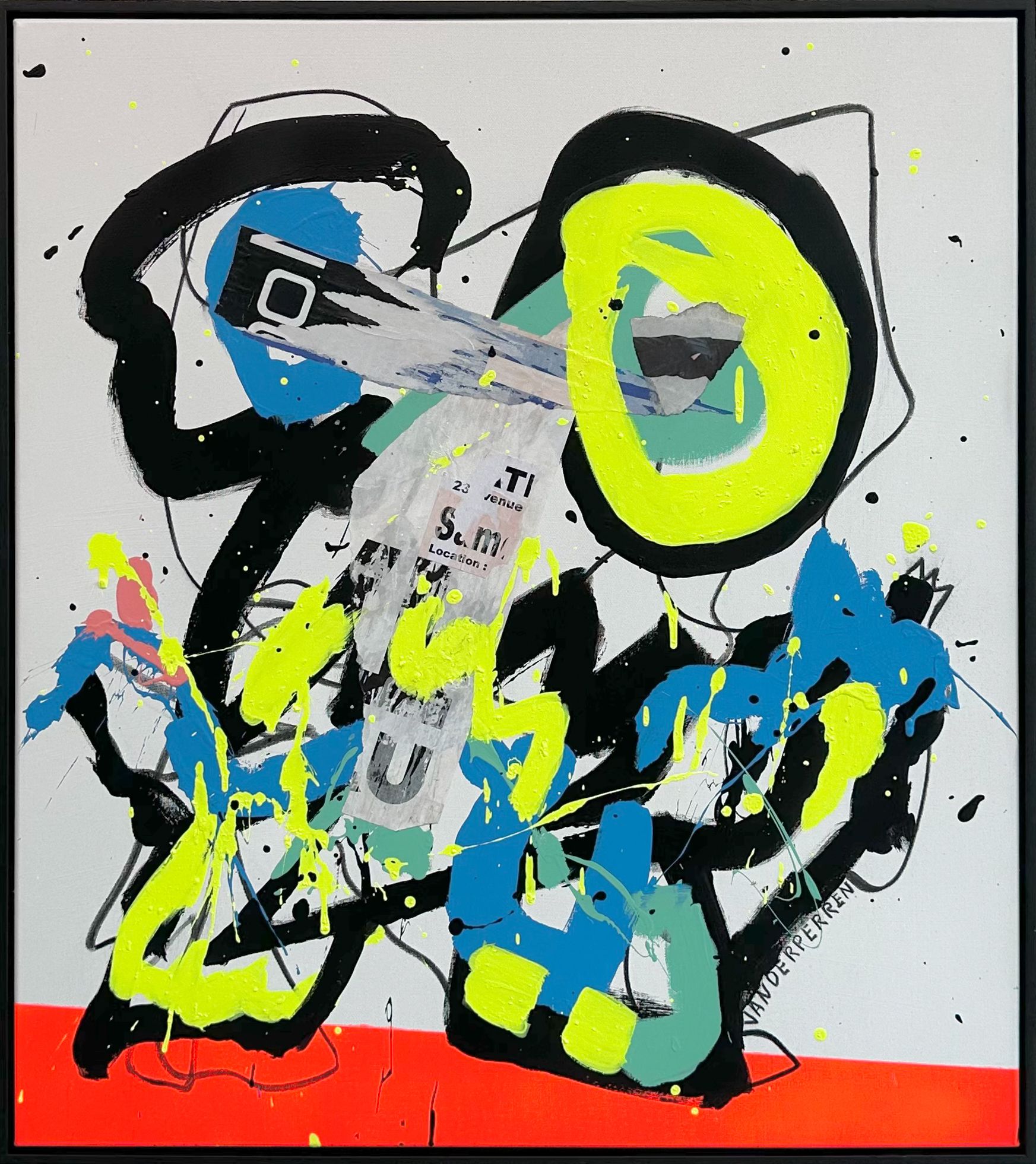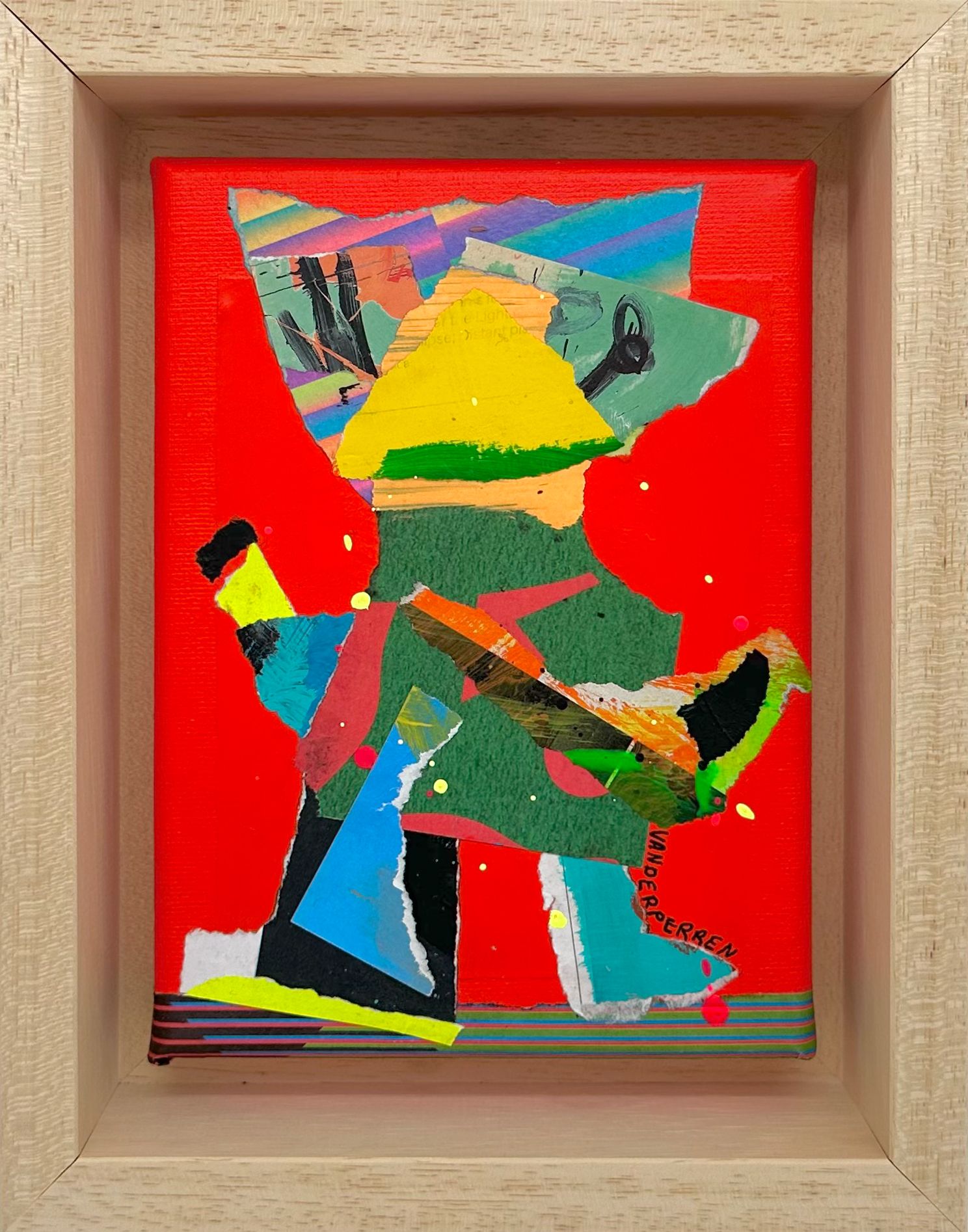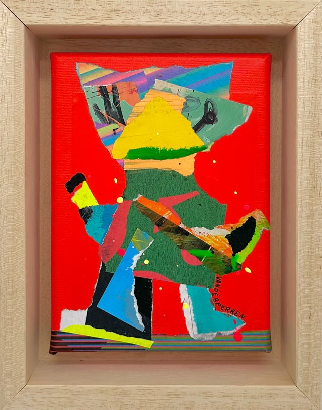 Vanderperren werkt met collage, schilderkunst en tekening in één beeld. Hij combineert gevonden materiaal met directe, bijna impulsieve verfstreken en lijnen. Die spanning tussen controle en toeval maakt het werk levend. De figuren die ontstaan hebben iets licht absurds, soms bijna kinderlijk, maar nooit naïef. Ze bewegen, kijken, bestaan zonder zich volledig prijs te geven.