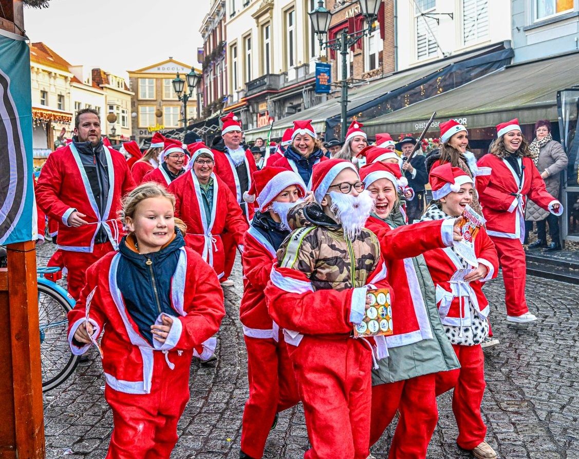 De Santarun gaat weer van start in Bergen op Zoom. Enkele honderden deelnemers verkleed als kerstman rennen door de stad voor een goed doel.