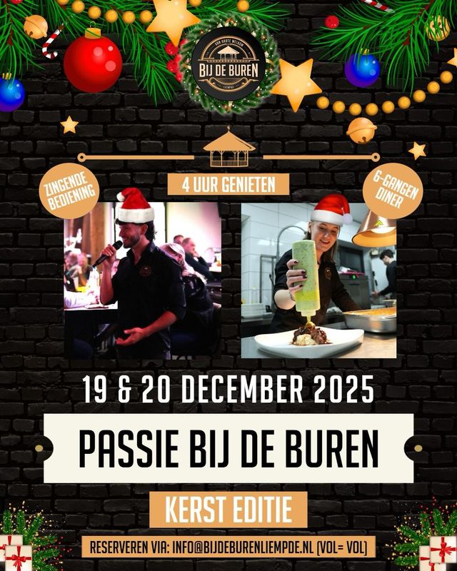 Vrijdag 19 -en zaterdag 20 december a.s. staat het event “Passie Bij De Buren” weer op de agenda! Deze keer in kerstsfeer, en…een vrouwelijke chef in de keuken! Wacht niet te lang met reserveren, want vol=vol!!