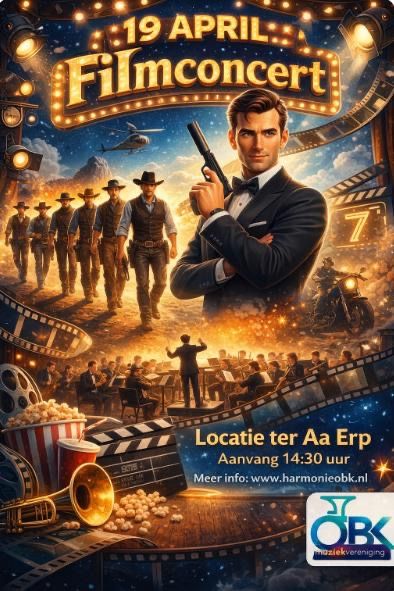 Muziekvereniging OBK presenteert: Filmconcert! Zondagmiddag 19 april om 14:30 uur (zaal open vanaf 14:00) vindt in Ter Aa in Erp (Den Uil 1a) een geweldig leuk filmconcert plaats voor jong én oud! Laat je meevoeren door prachtige filmmuziek met beelden en beleef een middag vol sfeer, herkenning en plezier. Of je nu een liefhebber bent van films, muziek, popcorn óf gewoon zin hebt in een gezellige middag uit, wees welkom! Deze bijzondere middag wordt georganiseerd door muziekvereniging OBK. Toegang is gratis! Dus neem gezellig familie en vrienden mee en geniet samen van ene fantastische middag!