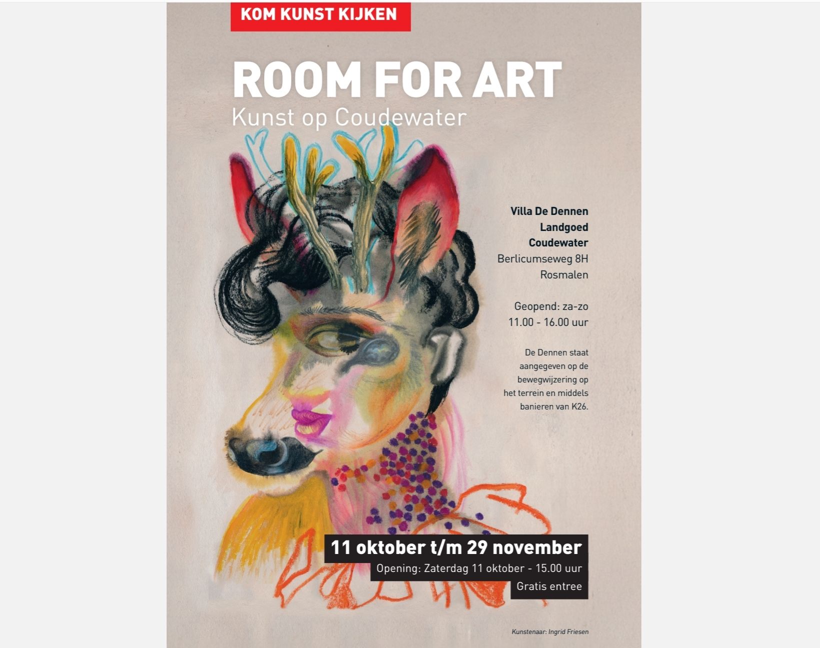 Room for art, kunst op Coudewater. van 11 oktober t/m 29 november 2025 Zaterdag en zondag 11.00u-16.00u Opening zaterdag 11 oktober om 15.00 uur. Na de succesvolle expositie ‘De stilte voorbij’ hebben 11 kunstenaars van K26 opnieuw hun intrek genomen in Villa De Dennen in Rosmalen.