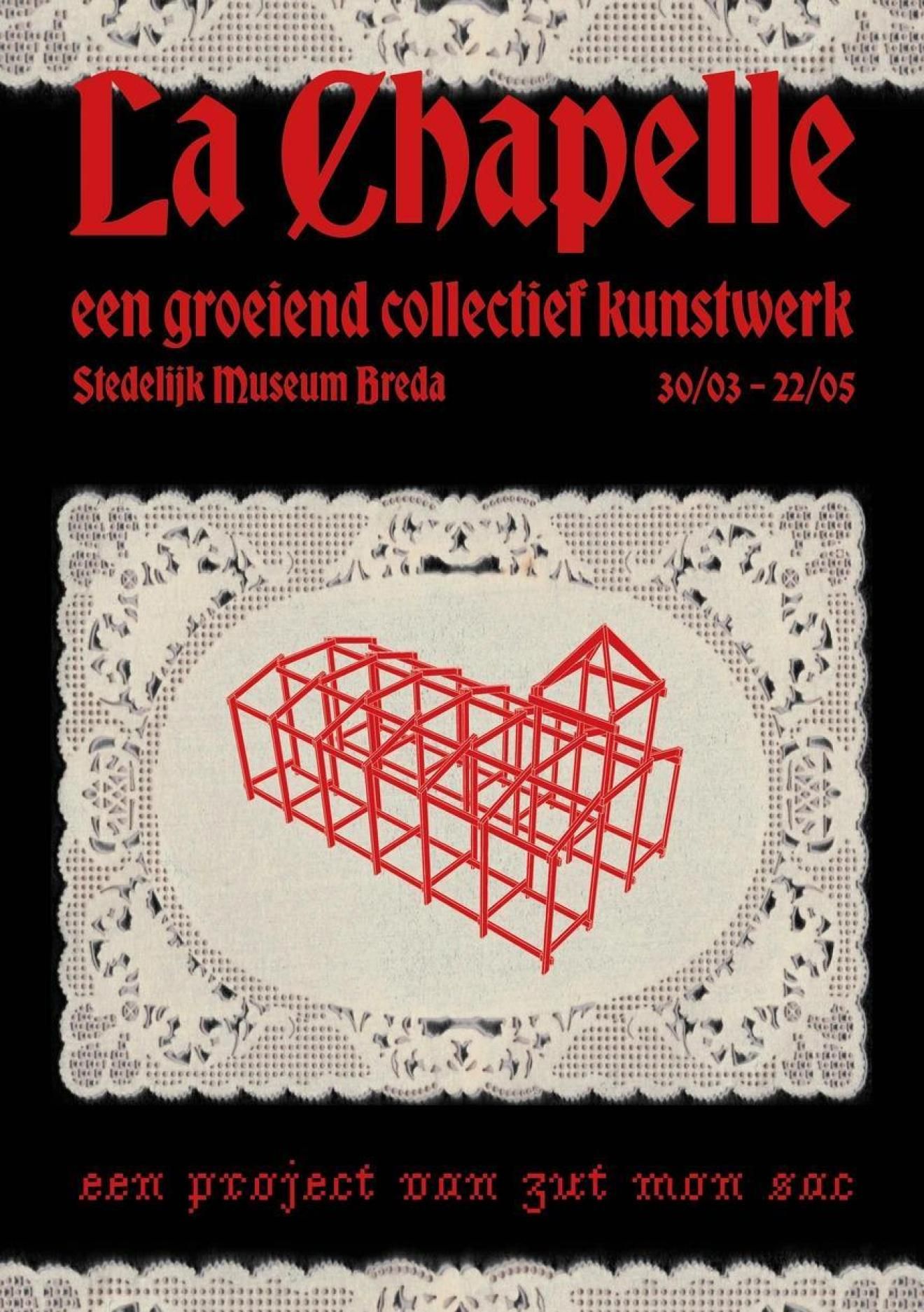 Kom langs en maak mee! In de periode van 30 maart t/m 22 mei is Zut Mon Sac regelmatig aan het werk in projectruimte NEXT (gratis te bezoeken). Iedereen is welkom om te kijken of zelf een stukje bij te dragen! Zut Mon Sac werkt op de volgende data aan La Chapelle in Next: