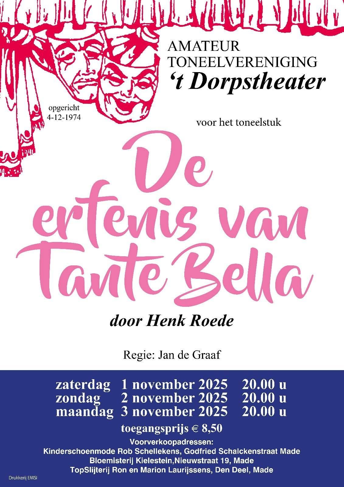 Made - Zet het eerste weekend van november maar vast in uw agenda: ’t Dorpstheater Made voert dan weer een klucht op in het Bernardus Theater in Made. Zaterdag 1, zondag 2 en maandag 3 november kunt u komen kijken naar ‘De erfenis van Tante Bella’. Een stuk geschreven door Henk Roede en geregisseerd door Jan de Graaf. Hij heeft er weer alles aan gedaan om er weer hilarische avonden te maken. De spelers en crew hebben er zin in om bij u de lachsalvo’s en tranen te ontfutselen. Het stuk gaat over, zoals ze zelf gedacht hadden, twee broers, dat ze na het overlijden van hun Tante Bella de wat gedateerde beautysalon hebben geërfd. Ze gaan het boeltje wat opknappen. Maar het kan beter verkocht worden als een goed lopende zaak. Het grootste probleem is dat Tante dus geen personeel had, en wat is dan de oplossing: De 2 bouwvakkers zullen dat klusje ook zelf moeten klaren in al hun onervarenheid. De broers wringen zich dus in allerlei moeilijke bochten, maar overal is een oplossing voor, mede door een beetje kennis van een stagiaire, zodat de vrouwelijke klanten geholpen kunnen worden. Al zijn de praktijken wat vreemd soms. Het volgende probleem is dat er nog een ver nichtje uit Canada ook recht heeft op haar aandeel (al weet ze nog niet dat haar lieve Tante nog niet gestorven is) en als het testament via de notaris boven water komt, blijkt alles nogal vreemd in elkaar te zitten. Al deze ingrediënten zorgen dat dit stuk weer stof is voor een mooi verhaal en een onvergetelijke avond. Zorg dat u er weer bij bent deze dagen. Alles gaat weer zoals u van onze vereniging gewend bent. De kaarten zijn weer in de verkoop voor de prijs van 8,50 euro. Verkoopadressen zijn Kinderschoenmode Rob Schellekens, Bottelier Laurijssens en Kielestein Bloemisterij op de bekende adressen. Bent er op tijd bij, want meestal zijn ze zo uitverkocht. KAARTEN KUNNEN ALLEEN KONTANT AFGEREKEND WORDEN !!