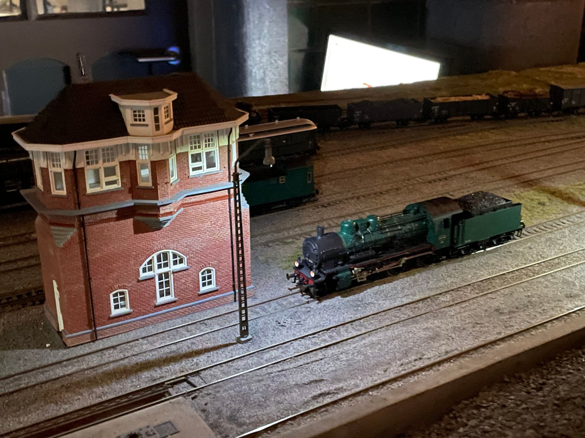 In deze sfeervolle periode voor kerst is de bijna 25 meter lange maquette van het Roosendaalse spoorwegemplacement prachtig verlicht met rijdende, verlichte treinen. Het cateringteam van de Modelspoorvereniging Post B zorgt voor iets lekkers.