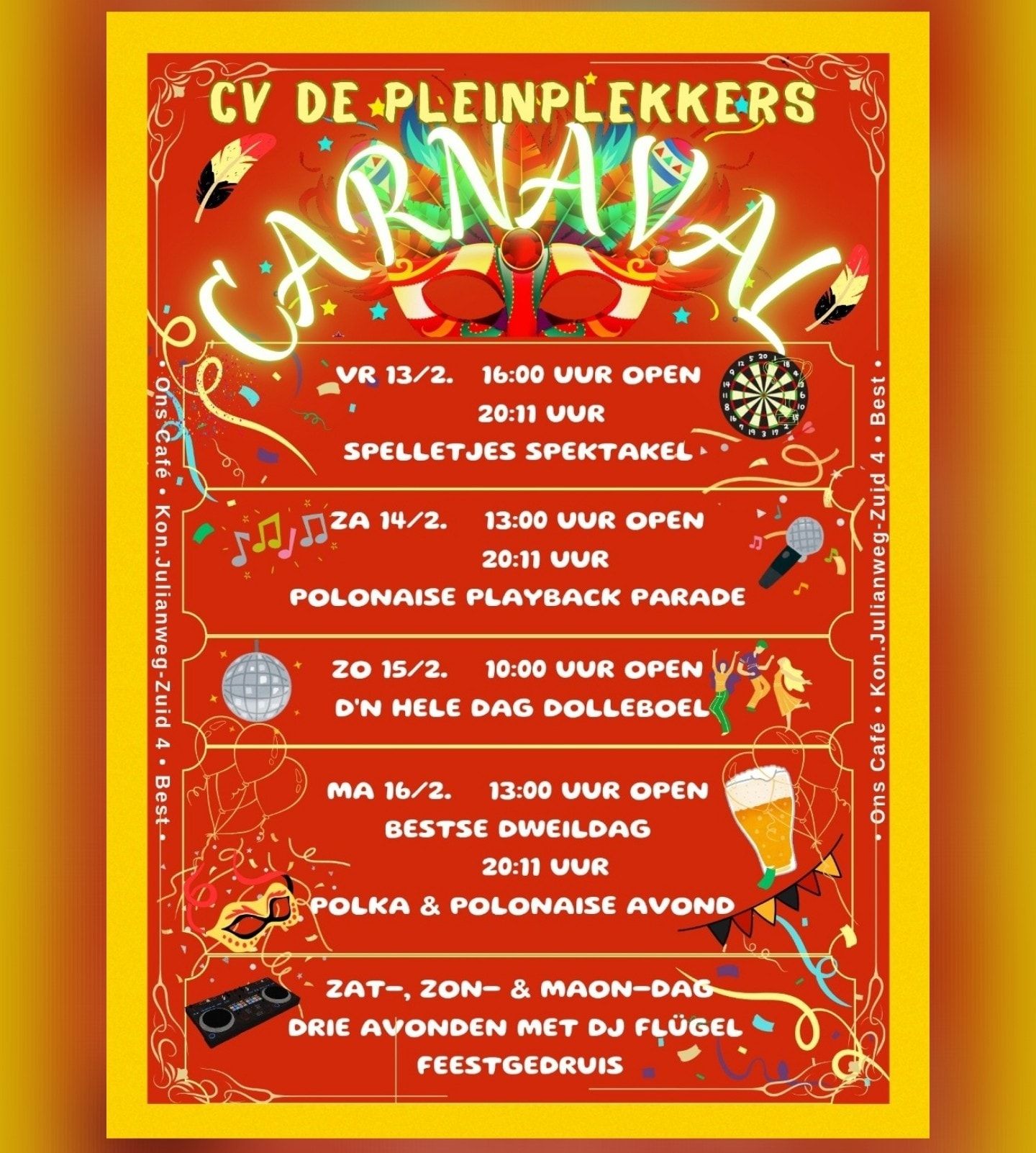 Vrijdag 13 t/m maandag 16 februari mede mogelijk gemaakt door CV De Pleinplekkers: Vier dagen lang alleen maar leut, lol en lawaai!