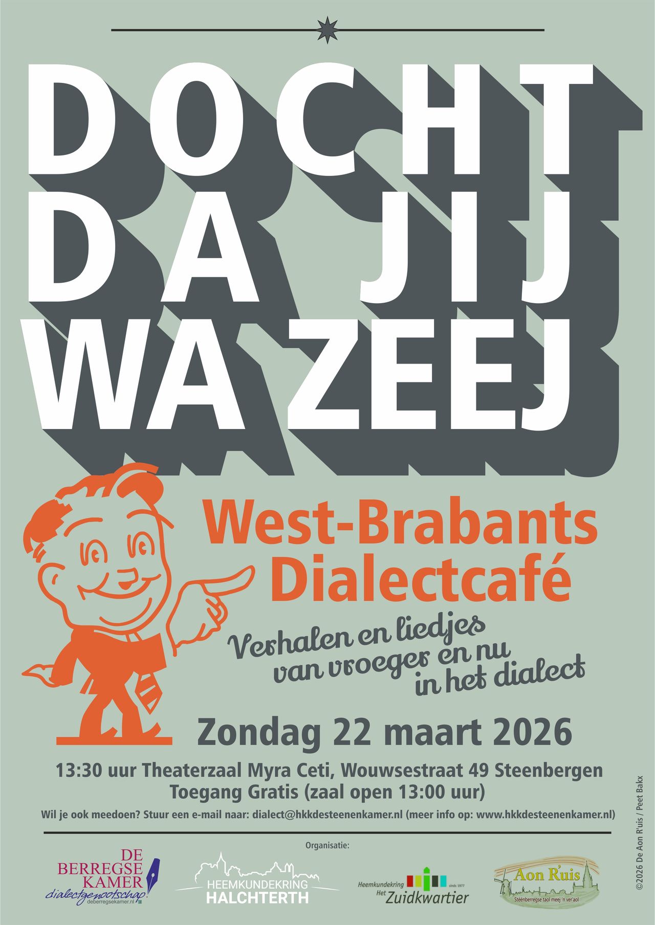 Het belooft weer een middag te worden in een gemoedelijke en gezellige ambiance met verhalen, liedjes en gedichten van vroeger en nu in de diverse West-Brabantse dialecten, waaronder natuurlijk de Steenbergse taal. Ook de gebruikelijke quiz mag niet ontbreken.