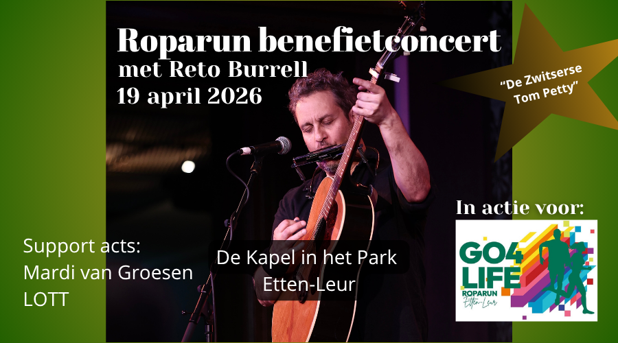 Tijdens het Roparun benefietconcert op zondagmiddag 19 april 2026 staat de Zwiterse singer-songwriter Reto Burrell centraal. Hij wordt ook wel de Zwiterse Tom Petty genoemd. Support acts zijn Mardi van Groesen (Etten-Leur) en LOTT (Breda).
