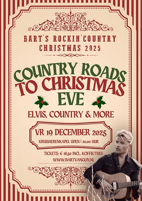Vier de mooiste tijd van het jaar met Bart van Gijn tijdens een avond vol Elvis, country en klassiekers in kerstsfeer. Vrijdag 19 december in de sfeervolle Kruisherenkapel in Uden.