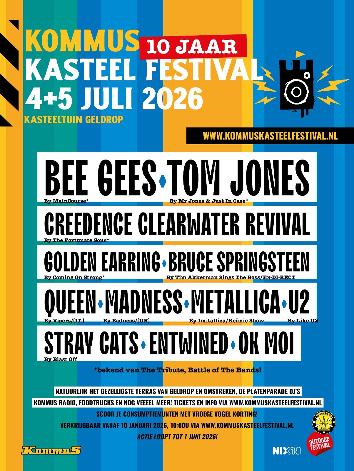 Het KommuS Kasteelfestival vindt in 2026 voor de 10e keer plaats. Zet 4 en 5 juli 2026 alvast in je agenda! Natuurlijk zijn we weer te gast in de Kasteeltuin van Geldrop. Tijdens het festival op zaterdag en zondag vind je op het grote podium te gekke (inter)nationale top (tribute/cover/revival) bands. Natuurlijk ook dit jaar weer het nodige aan theater acts, onze vrienden van de de Platenparade dj’s en meer. En voor de thuisblijvers zend KommuS Radio weer live uit vanuit de Kasteeltuin. Met elke editie veel gezellige feestvierders voor het podium, enthousiaste bands, acts en een geweldige vrijwilligers-crew is het Kasteelfestival HET zomerse evenement in Geldrop-Mierlo. Volg www.facebook.com/kommus-geldrop voor updates.
