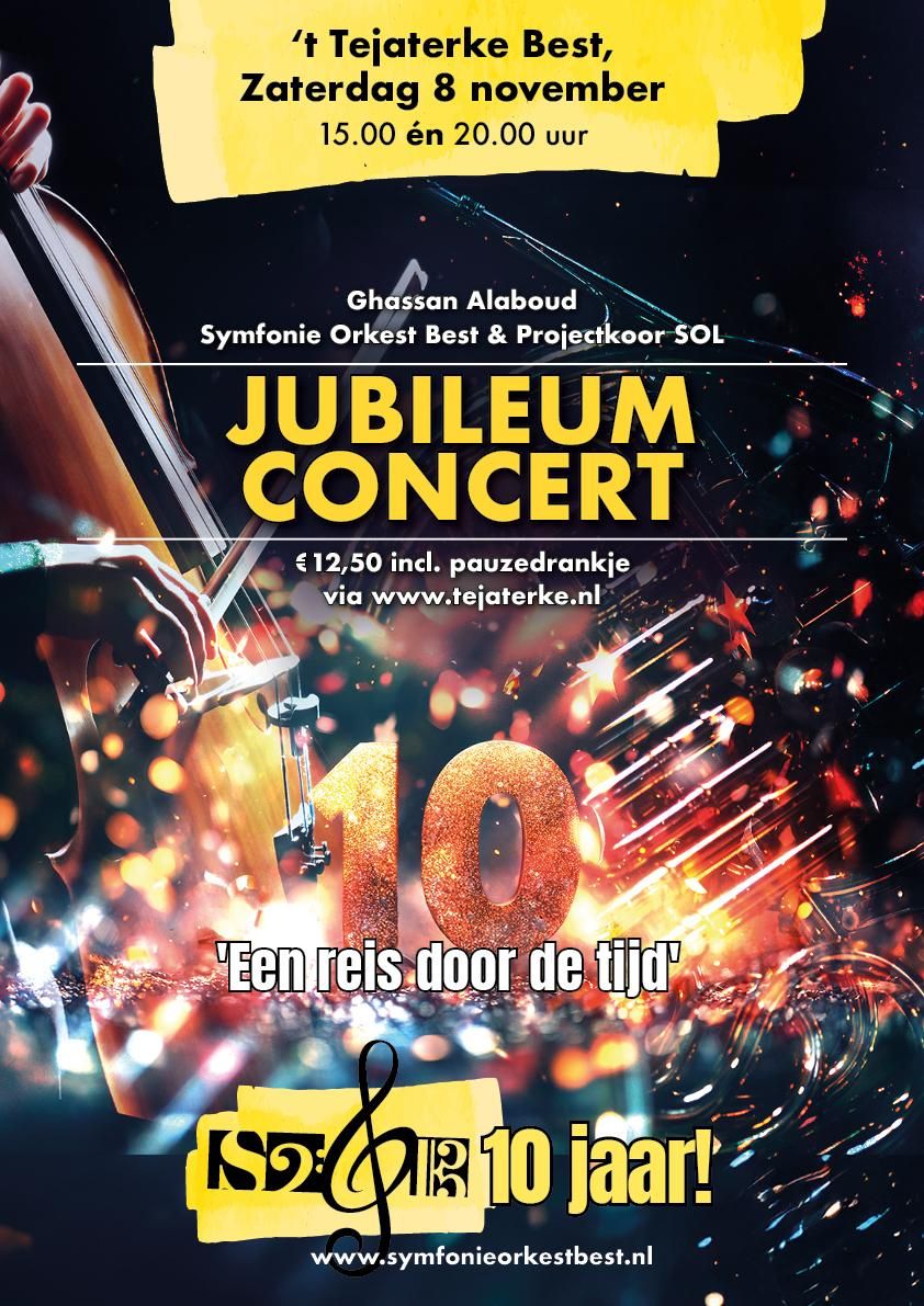 Symfonie Orkest Best bestaat 10 jaar en dat moet gevierd worden! Tijdens dit jubileumconcert zal een reis door de tijd worden gemaakt, waar de muzikale hoogtepunten van de afgelopen 10 jaar voorbij zullen komen. Daarnaast zal het orkest samenwerken met Projectkoor SOL uit Best, waar zij ook al eens mee hebben gespeeld ter gelegenheid van 200 jaar Best in 2019. Samen zullen zij ook enkele nieuwe nummers ten gehore brengen. Er zullen klassieke stukken worden gespeeld, maar natuurlijk zal er ook filmmuziek voorbijkomen en popmuziek zal tevens niet ontbreken! Het belooft een feestelijke middag/avond te worden, dus trek je mooiste kleding aan en zorg dat je erbij bent! Kaarten kosten €12,50 inclusief consumptie in de pauze en zijn te koop via www.tejaterke.nl