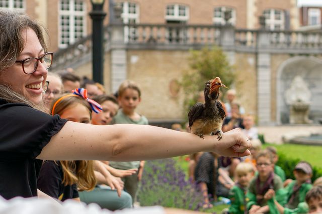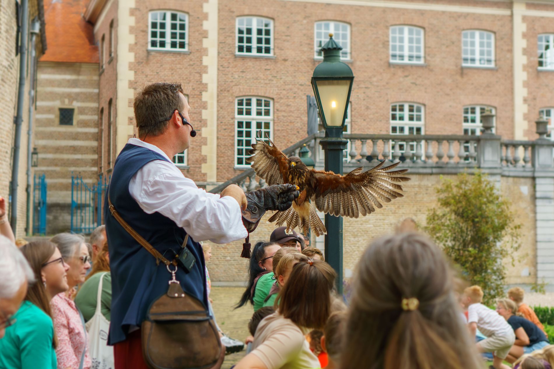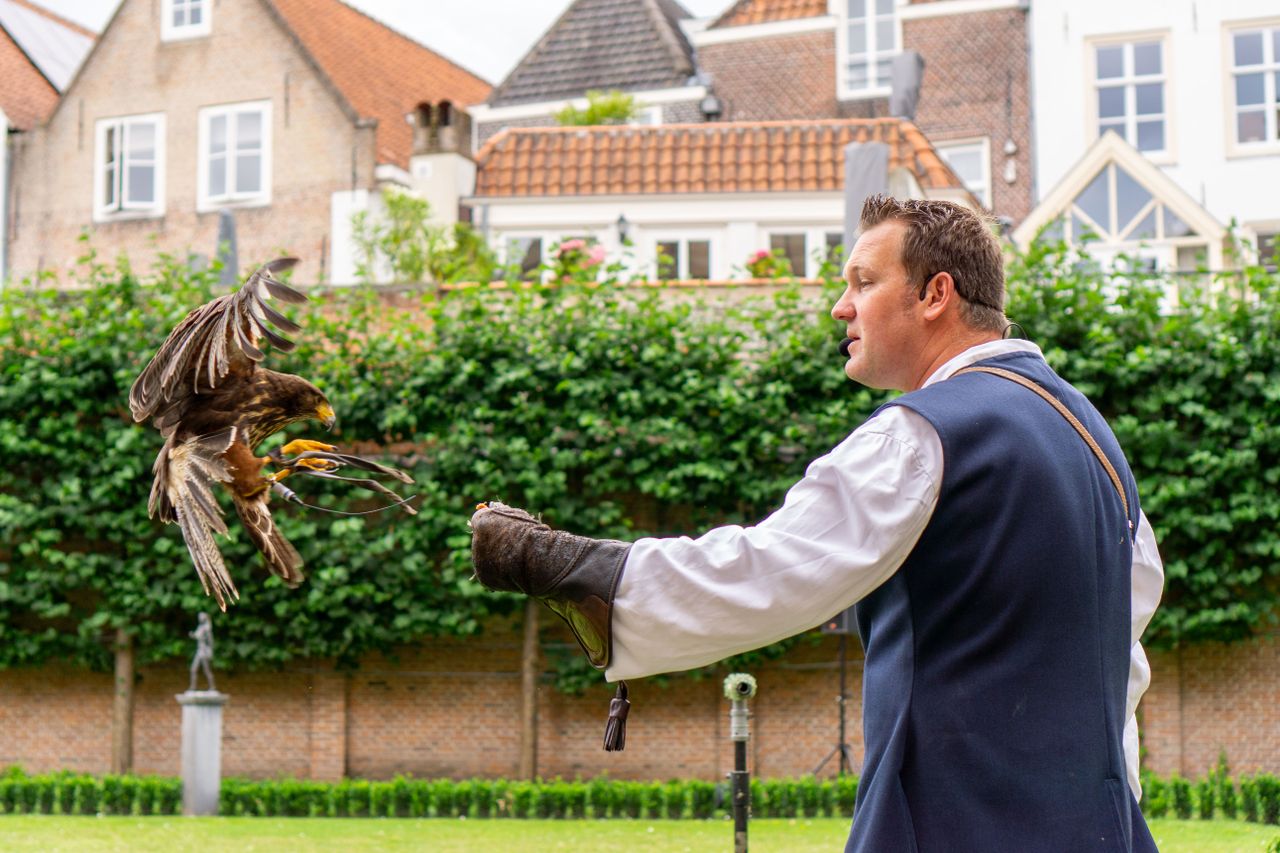 Gekleed in middeleeuwse kostuums geven valkeniers samen met hun vogels een indrukwekkende show in de Franse tuin van het Markiezenhof.