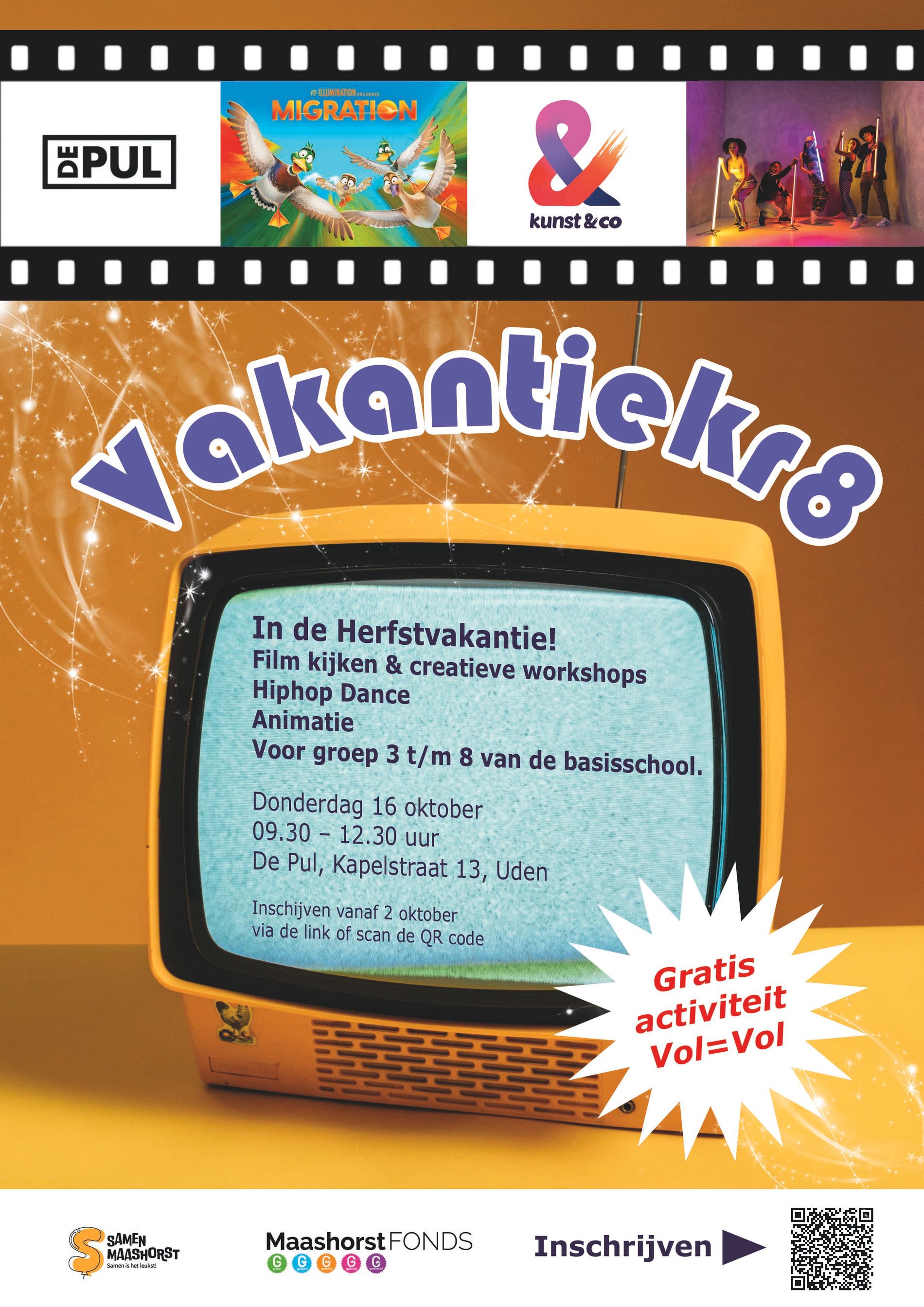 Zoek je in de schoolvakantie een leuke én gratis activiteit voor je kind? Samen met Kunst & Co organiseert De Pul Vakantiekr8, speciaal voor kinderen van 6 t/m 12 jaar (groep 3 t/m 8). We starten met een filmvoorstelling, waarbij je als ouder samen met je kind de zaal in mag. Daarna volgen workshops waarin de kinderen kiezen tussen hiphop/dance of animatie. Jij kunt ondertussen rustig wachten in de kleine zaal of in onze foyer, waar ook ruimte is om elkaar te ontmoeten of even te werken. Het is ook mogelijk om je kind af te zetten en naderhand weer op te halen.