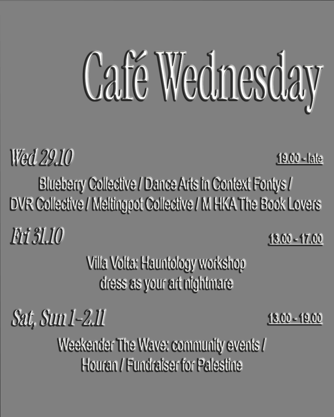 Café Wednesday is een reeks aan cafesessies in het Van Abbehuis. De opening bestaat uit een sonate, een radioprogramma met bezoekers, bewegingsoefeningen die worden opgenomen en tegelijkertijd gelivestreamed, een rave in een kelder (of een representatie daarvan) en een fundraiser.