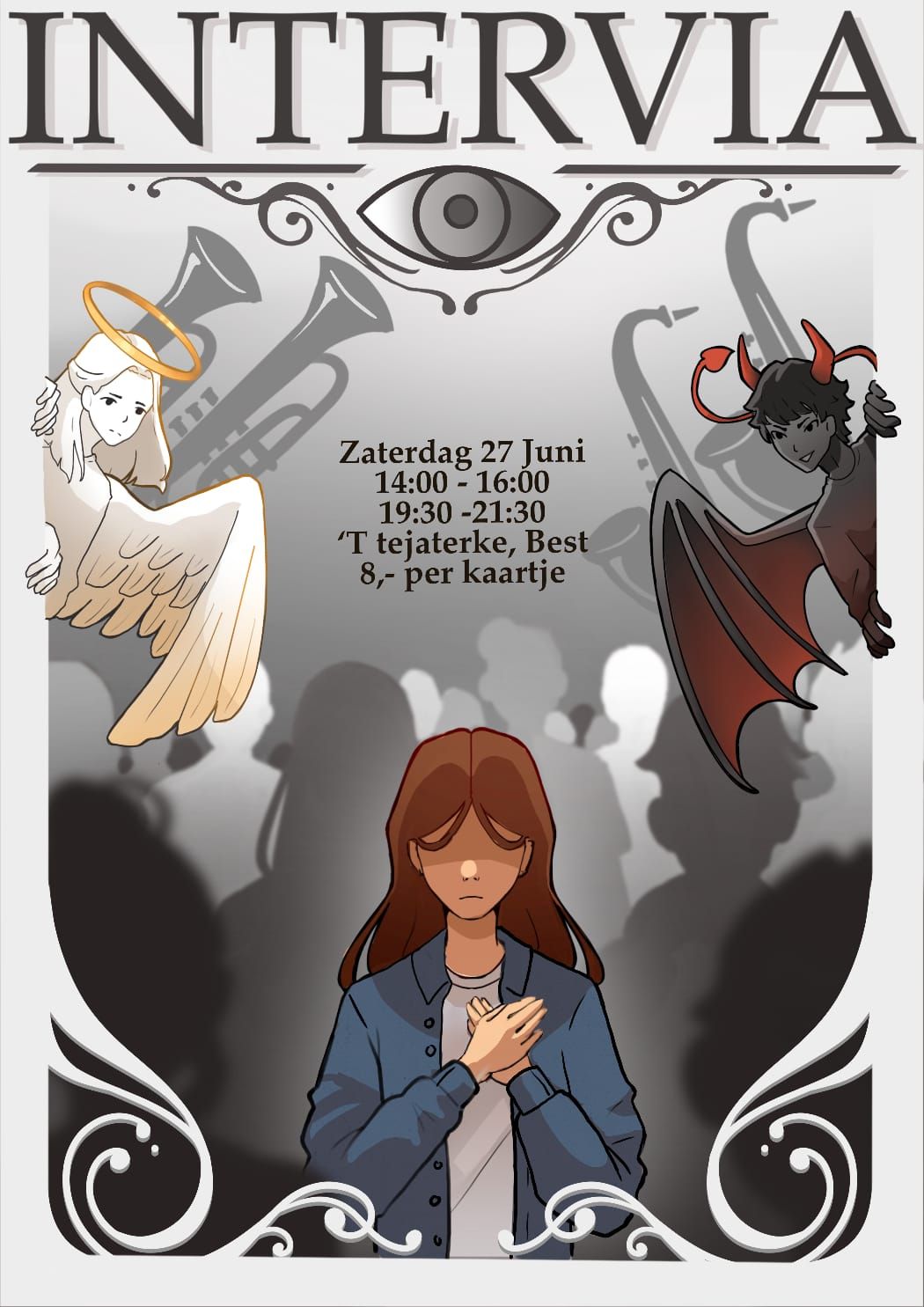 Met originele teksten, eigen choreografieën en live muziek van een jazzband is Intervia een voorstelling over keuzes, schuld, verleiding en de kracht van vergeving. Een voorstelling vol hart, symboliek en jeugdige creativiteit, gemaakt dóór jongeren, vóór iedereen die ooit heeft getwijfeld aan zichzelf.