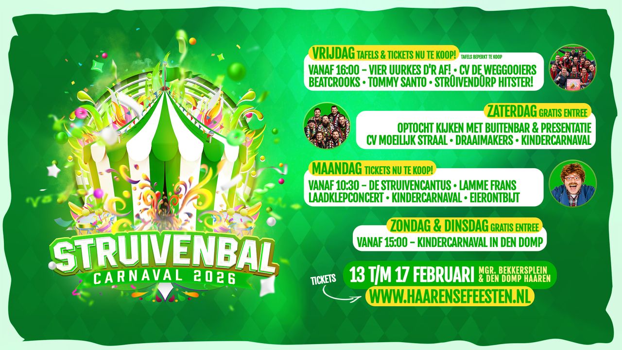 Het Struivenbal vindt opnieuw plaats in een feesttent op het Monseigneur Bekkersplein. Vanaf vrijdag 13 februari tot en met dinsdag 17 februari barst het feest los.