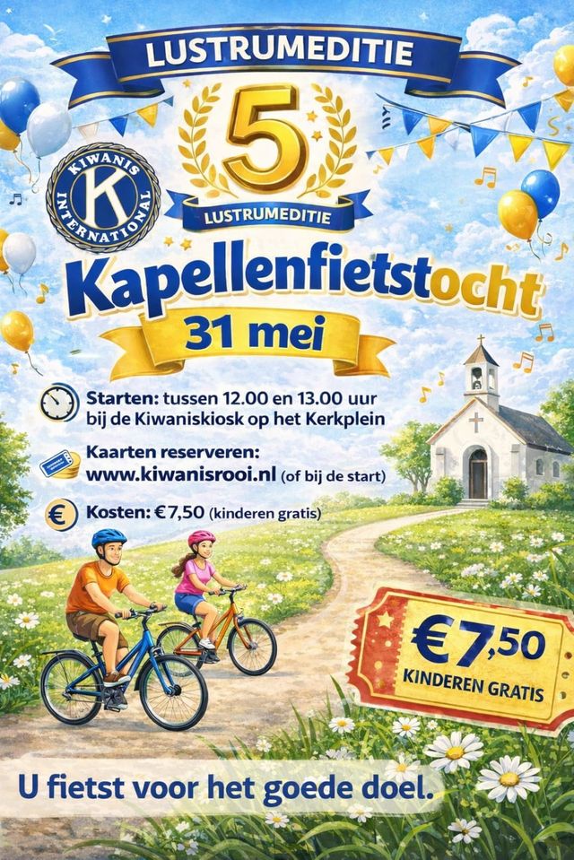 Op zondag 31 mei aanstaande kleurt het Brabantse landschap weer 'Kiwanis-blauw'. Kiwanis Rooi organiseert dan de vijfde editie van de inmiddels vertrouwde Kapellenfietstocht. Dit eerste lustrum belooft een mooie te worden, waarbij sportiviteit, cultuur en gezelligheid samenkomen voor het goede doel.
