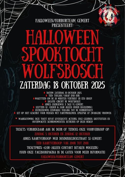 Op 18 oktober een Halloween Spooktocht Wolfsbosch te Gemert. Startpunt Energieweg 9 te Gemert.