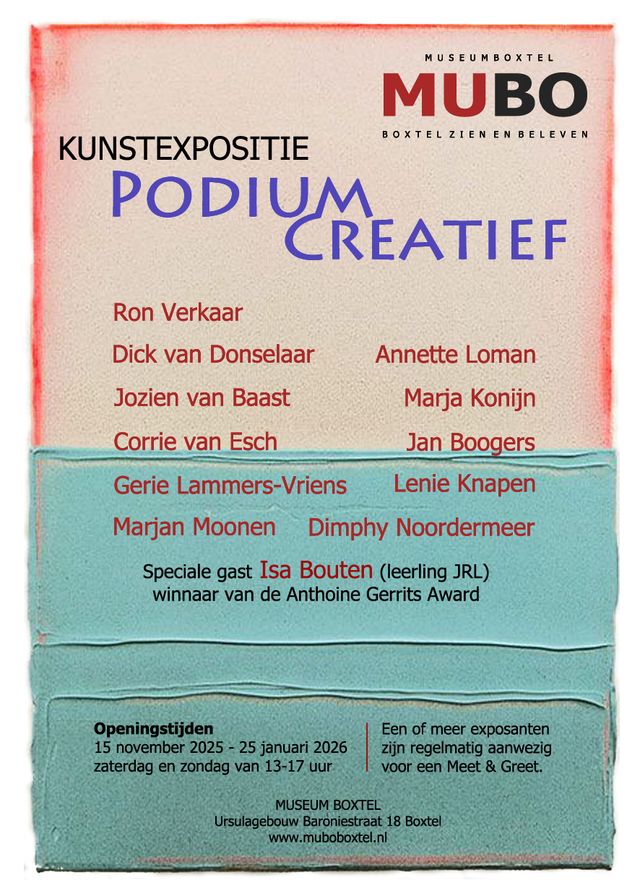 Van 15 november 2025 tot en met 25 januari 2026 organiseert Museum Boxtel (MUBO) voor de vierde keer een podium voor creatieve Boxtelaren. Deze keer tonen twaalf creatievelingen hun kunstwerken in een prachtige expositie met een grote variatie aan kunstuitingen. Kortom qua inhoud en presentatie een niet te missen expositie in deze donkere dagen en de moeite van een bezoek meer dan waard.