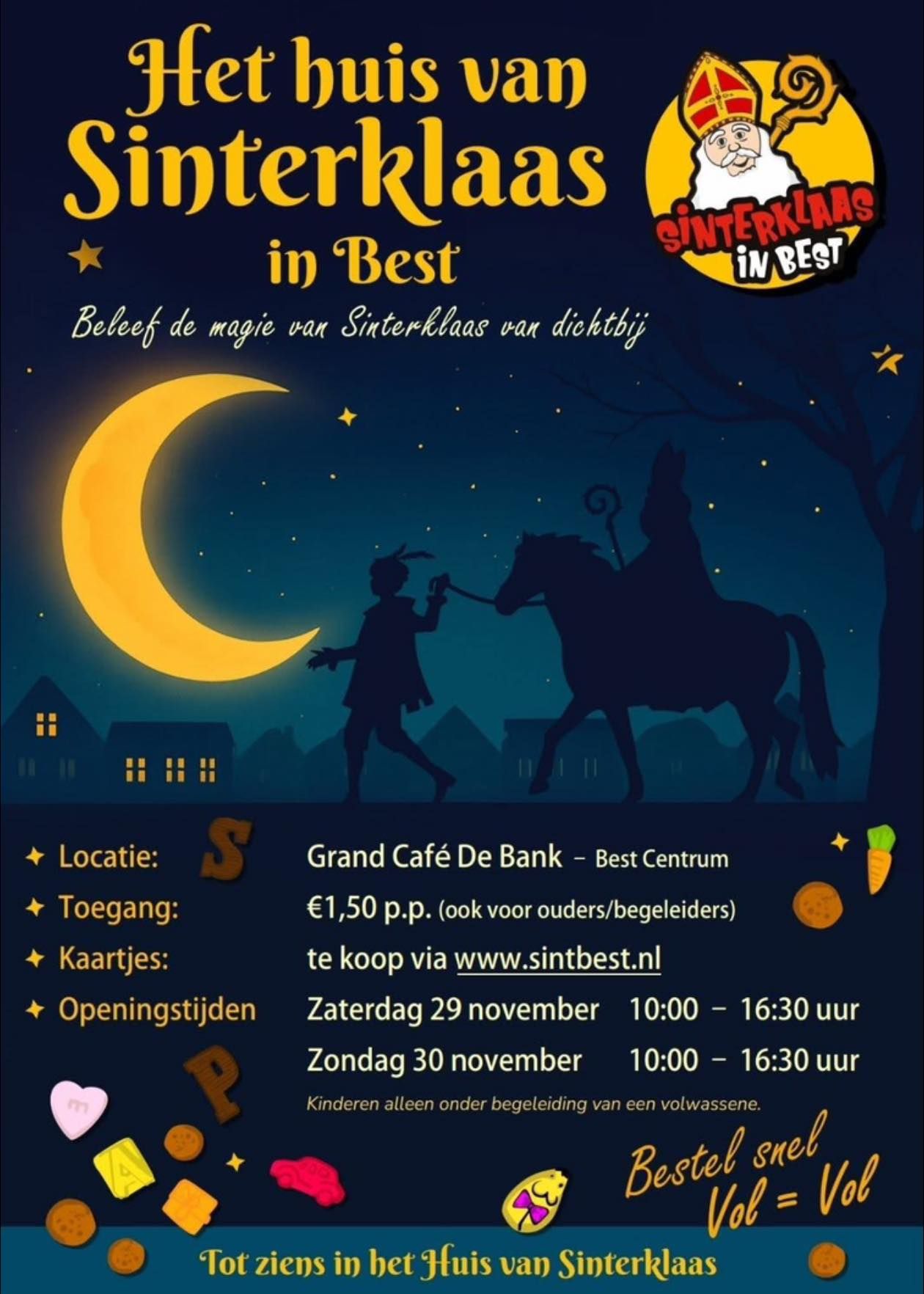 29 & 30 nov - Kom jij ook een kijkje nemen? Je kunt Sinterklaas ontmoeten, gezellig met hem en de pieten praten en natuurlijk samen op de foto. Grand Café De Bank. Schrijf je snel in via https://sintbest.nl/huis-van-sinterklaas