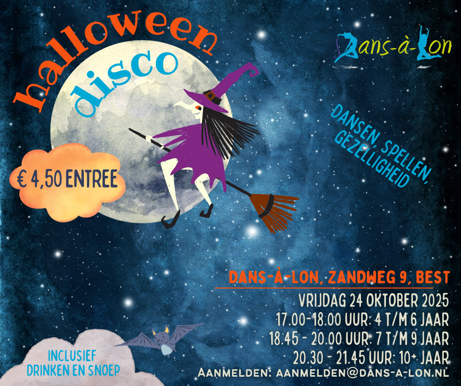Halloween Disco 24 oktober 2025 โ Disco โ voor jezelf en je vrienden!! aanmelden@dans-a-lon.nl Op vrijdag 24 oktober is het weer tijd om te griezelen, dansen en spelen tijdens onze Halloween Disco! Trek je engste outfit aan en beleef een avond vol gezelligheid, spelletjes en natuurlijk heel veel dans. ๐โจ ย ๐ Vrijdag 24 oktober 2025 ๐ 17.00-18.00 uur | 4 t/m 6 jaar ๐ 18.45-20.00 uur | 7 t/m 9 jaar ๐ 20.30-21.45 uur | 10+ jaar ย ๐ Zandweg 9, Best ๐ฐ โฌ4,50 (incl. drinken & snoep) ย Voor leden รฉn niet-leden โ iedereen is welkom! Wees er snel bij en verzeker jezelf van een spooktaculair plekje, want VOL=VOL Aanmelden via: aanmelden@dans-a-lon.nl