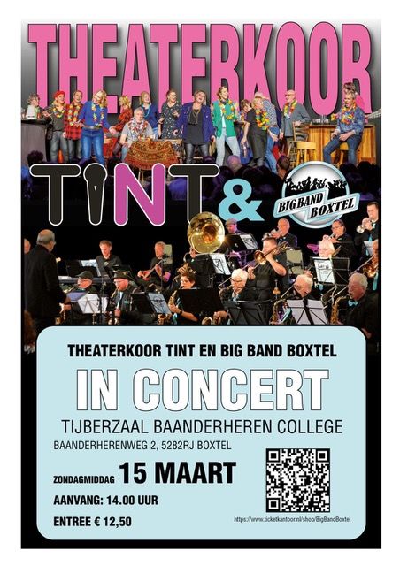 Geniet van een bijzonder concert waarin theaterkoor TINT samen met Big Band Boxtel een sfeervolle en muzikale voorstelling brengt. Bekende bigband klanken, warme melodieën en een meeslepend verhaal nemen u mee terug in de tijd en raken tegelijk het hart. De combinatie van live muziek en theater zorgt voor een ontspannen, gezellige én ontroerende belevenis. Een uitgelezen moment om samen te genieten, herinneringen op te halen en u te laten verrassen door de kracht van muziek en spel. Muziek om van te genieten, theater om te beleven.