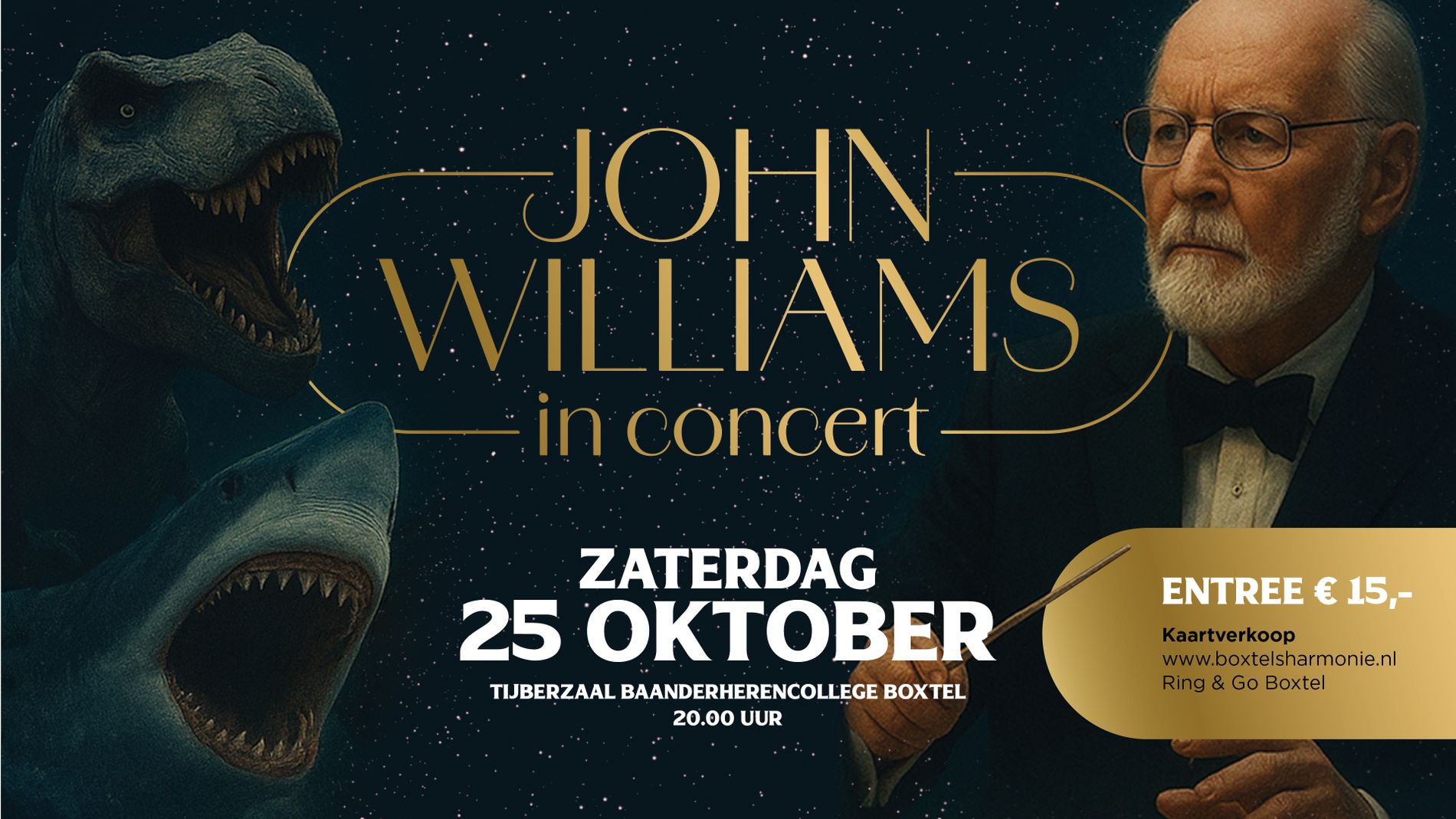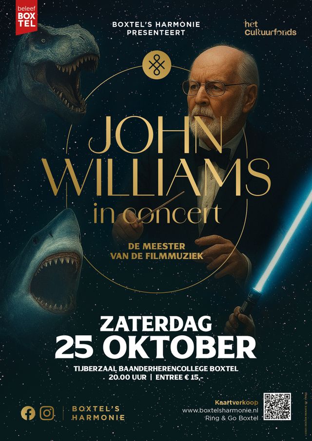 Stap op zaterdag 25 oktober in een wereld vol filmklassiekers! Boxtel’s Harmonie brengt een muzikale ode aan de grootste componist van Hollywood: John Williams. Van de meeslepende thema’s uit Star Wars en Indiana Jones tot de ontroerende klanken van Schindler’s List en de spanning van Jaws. Deze avond staat volledig in het teken van onvergetelijke filmmuziek.