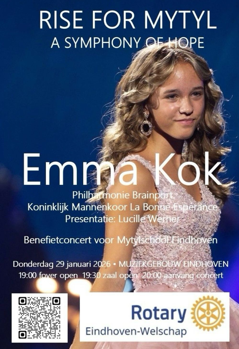 Rotary Eindhoven-Welschap organiseert een benefietconcert in het Muziekgebouw Eindhoven, met Emma Kok, Philharmonie Brainport en het Koninklijk Mannenkoor La Bonne Espérance. Het geheel wordt gepresenteerd door Lucille Werner.