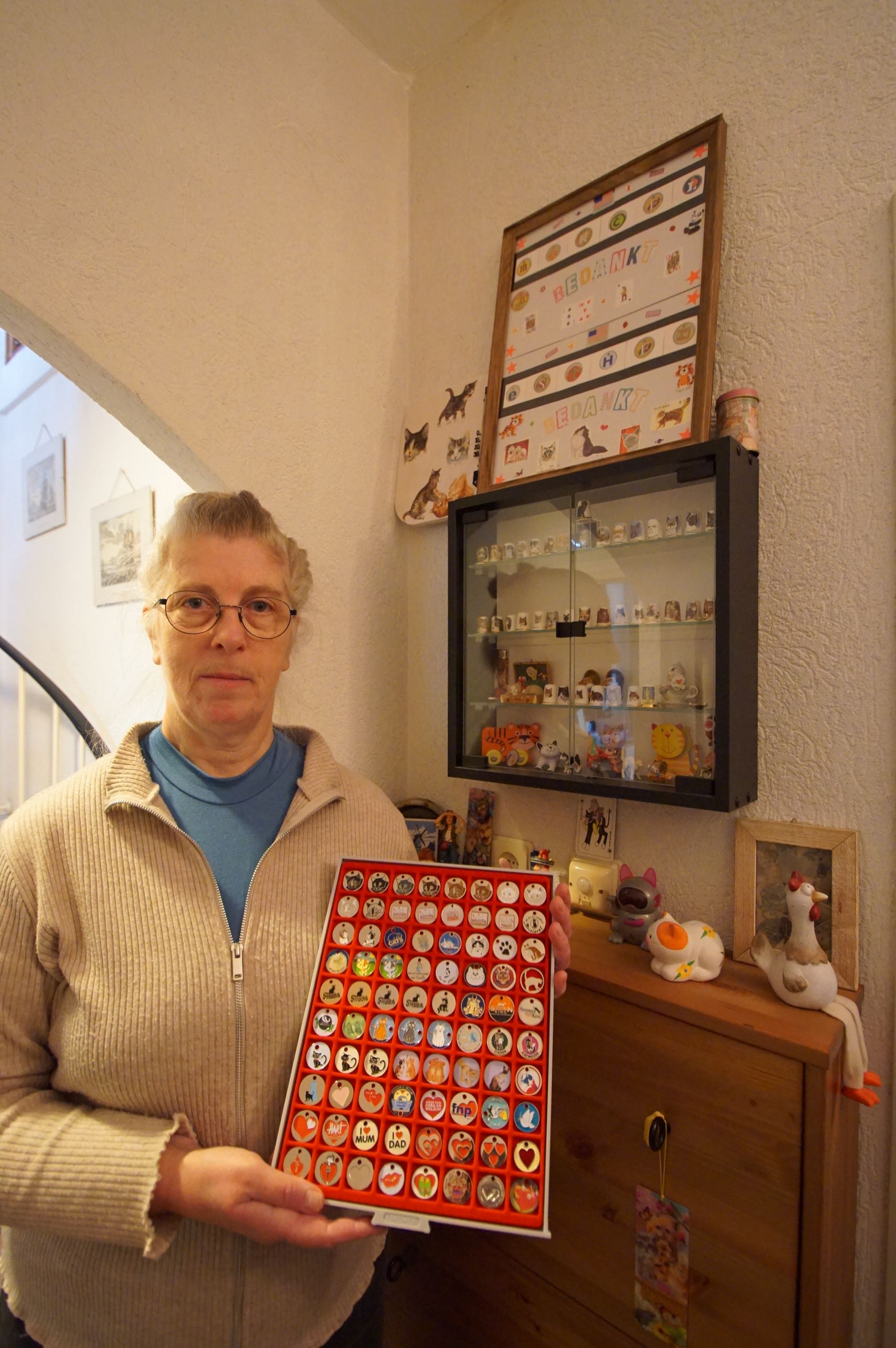 Op deze verzamelbeurs is ook weer een expositie te bezichtigen. Dit keer exposeert de 60-jarige Esther uit Veghel haar verzameling postzegels en winkelwagenmuntjes met poezen afbeeldingen. Ook allerlei aanverwanten attributen met poezen afbeeldingen zoals: vingerhoedjes, verschillende beeldjes enz. Esther is in 2005 “besmet” met het verzamelvirus door haar man. Die is een zeer actieve verzamelaar van allerlei verzamelobjecten en organisator van verzamelbeurzen in Veghel. De eerste verzameling van Esther zijn de poezen op postzegels. Later zijn allerlei andere attributen zoals winkelwagenmuntjes, beeldjes, vingerhoedjes e.d. bijgekomen.
