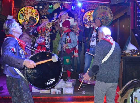 Carnavalsbands zeulen van café naar café.