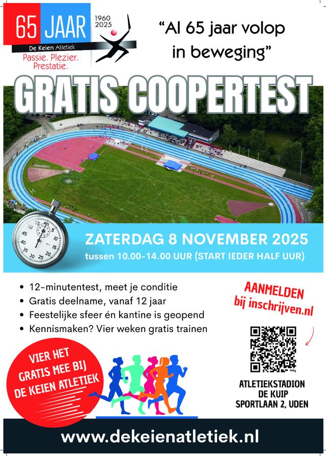 De Keien Atletiek viert 65 jaar met een Coopertest op 8 november. Doe mee op de snelle Mondobaan in Uden. Start elke 30 min van 10:00-14:00. Vanaf 12 jaar.