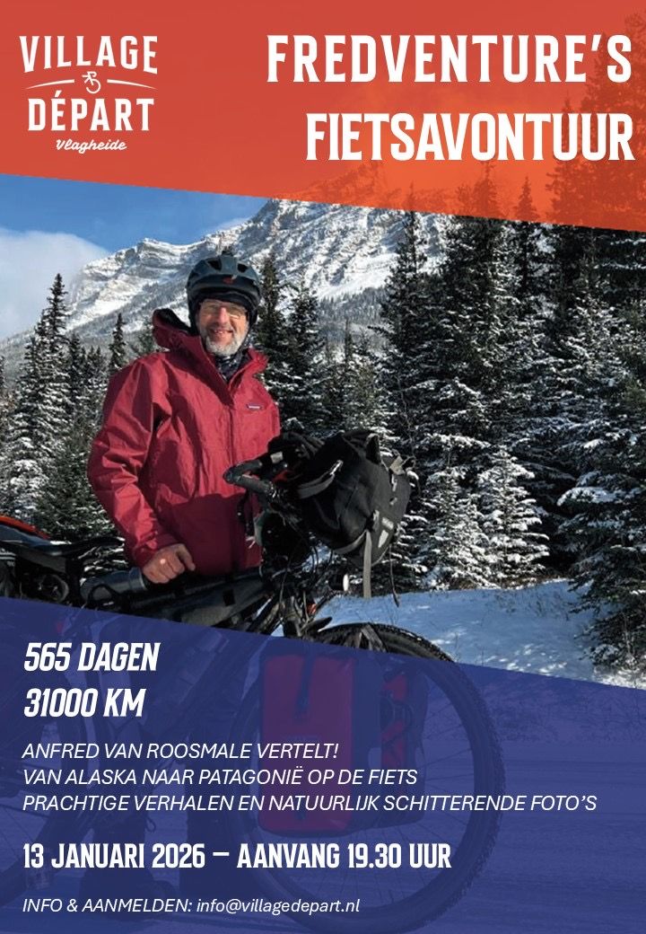 Op dinsdagavond 13 januari 2026 is bij Village Départ in Schijndel een bijzondere lezing te beleven. Anfred van Roosmale uit Nuenen vertelt over zijn indrukwekkende reis van Alaska naar Patagonië. In anderhalf jaar tijd legde hij op de fiets dit enorme traject af — een tocht vol uitdagingen, ontmoetingen en onvergetelijke momenten.