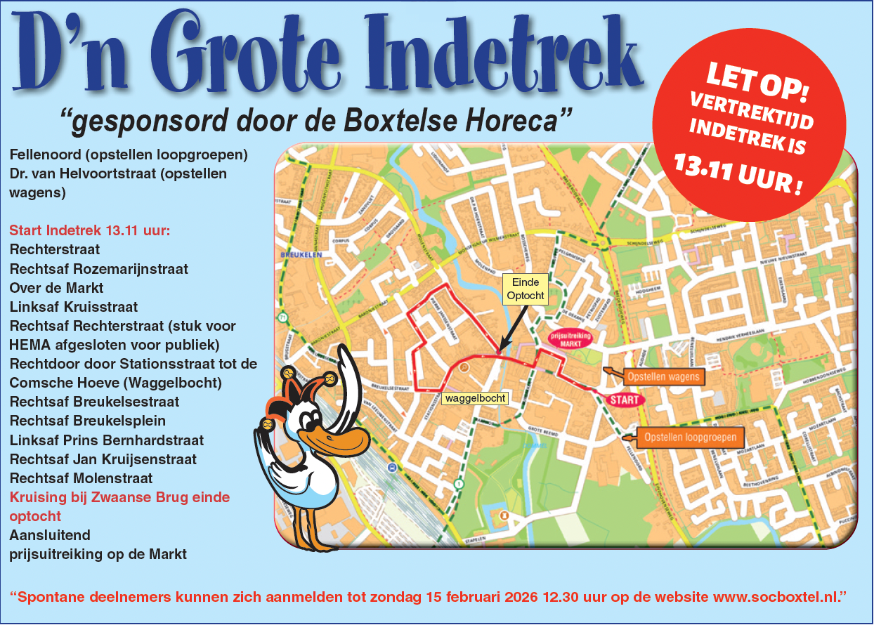 De Grote Indetrek in Boxtel (Indegat) vindt plaats op zondag 15 februari vanaf 13.11 uur.
