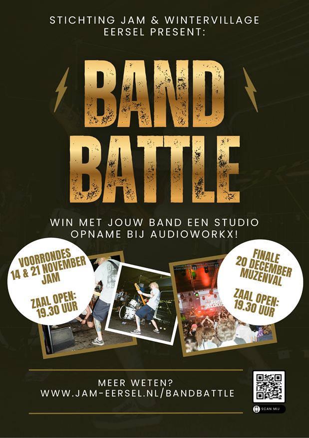 De Battle of the Bands is een mooie samenwerking tussen Stichting JAM en Winter Village Eersel. In deze finale strijden bands om een prachtige prijs, namelijk een professionele studio opname bij Audioworkx! Op 14 & 21 november vinden de voorrondes plaats en kun je gratis komen luisteren vanaf 19:30 uur. Op 20 december is de grote finale, ook vanaf 19:30 uur. Meer weten? www.jam-eersel.nl/bandbattle