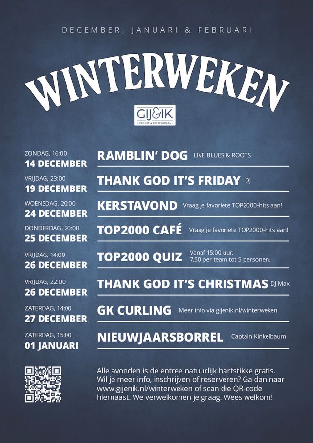 Daarnaast zijn de cocktails op woensdagavonden bij Gij&Ik verkrijgbaar voor 5,00 en op donderdagen zijn de flesjes bier vanaf 2.50. Via www.gijenik.nl/winterweken vind je alle evenementen, waaronder livemuziek én een heuze TOP2000-quiz!