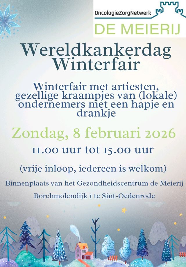 Na het succes van vorig jaar organiseert het Oncologisch Zorgnetwerk de Meierij (OZNM) op 8 februari weer een Winterfair. Kom langs en snuffel langs leuke kraampjes, geniet van live muziek, doe mee met de loterij en dat alles onder het genot van een lekker hapje en drankje. Van 11.00-15.00 uur is iedereen welkom in het Gezondheidscentrum de Meierij.