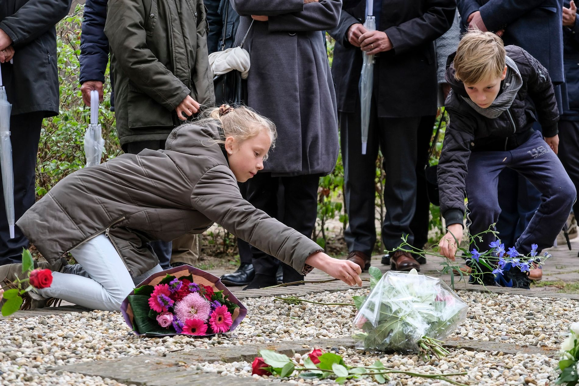 Bezoekers ontvangen voorafgaand aan de herdenking een portret van een slachtoffer van Kamp Vught. Ceremoniemeester Koos Theuws nodigt iedereen uit om na het deflié het portret te plaatsen nabij het crematoriumgebouw. Je kunt bloemen leggen bij de asputten.