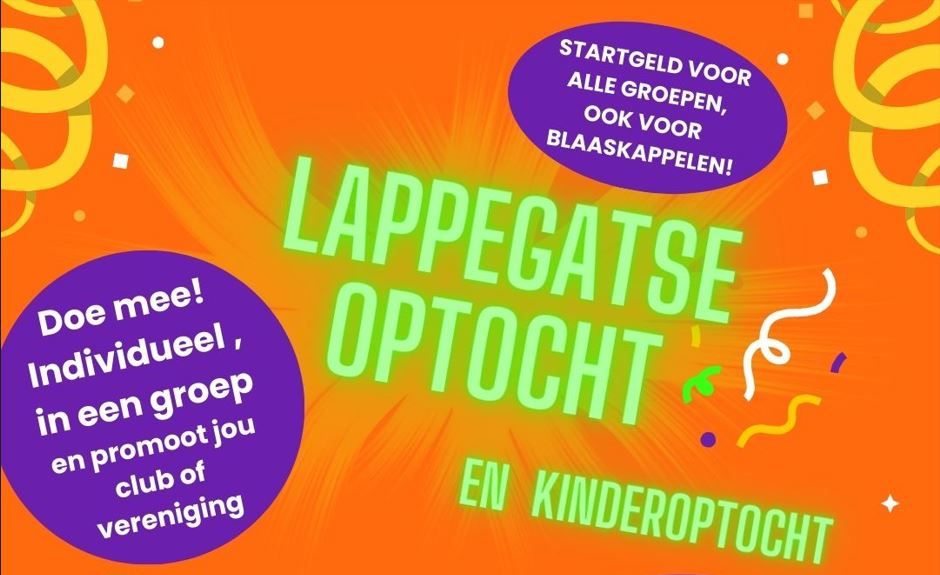 Na ook een knallend tweede jaar hebben we als Stichting de Drie Harten besloten om ook dit jaar de Lappegatse Carnavalsoptocht (Geldrop) weer te gaan organiseren. Wanneer: Dinsdagmiddag 17 Februari 2026 14:11u Voor wie: Er is plaats voor: -Wagens, -Dweilorkesten en muziekgroepen, -Grote loopgroepen, -Individuen en kleine loopgroepen, - Deelnemers kinderoptocht We nodigen alle BSO’s, scholen en (jeugd-)verenigingen uit om zichzelf te promoten tijdens deze optocht.