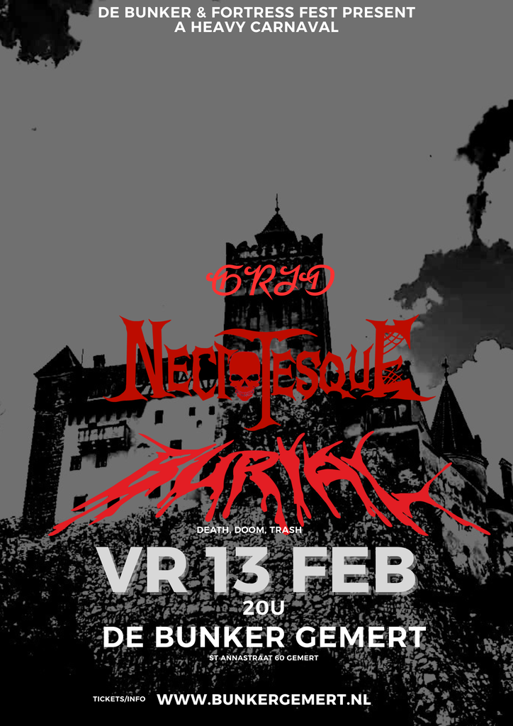 Op 13 februari een Heavy carnaval met Grid,Necrotesque en Burial bij poppodium de Bunker te Gemert.