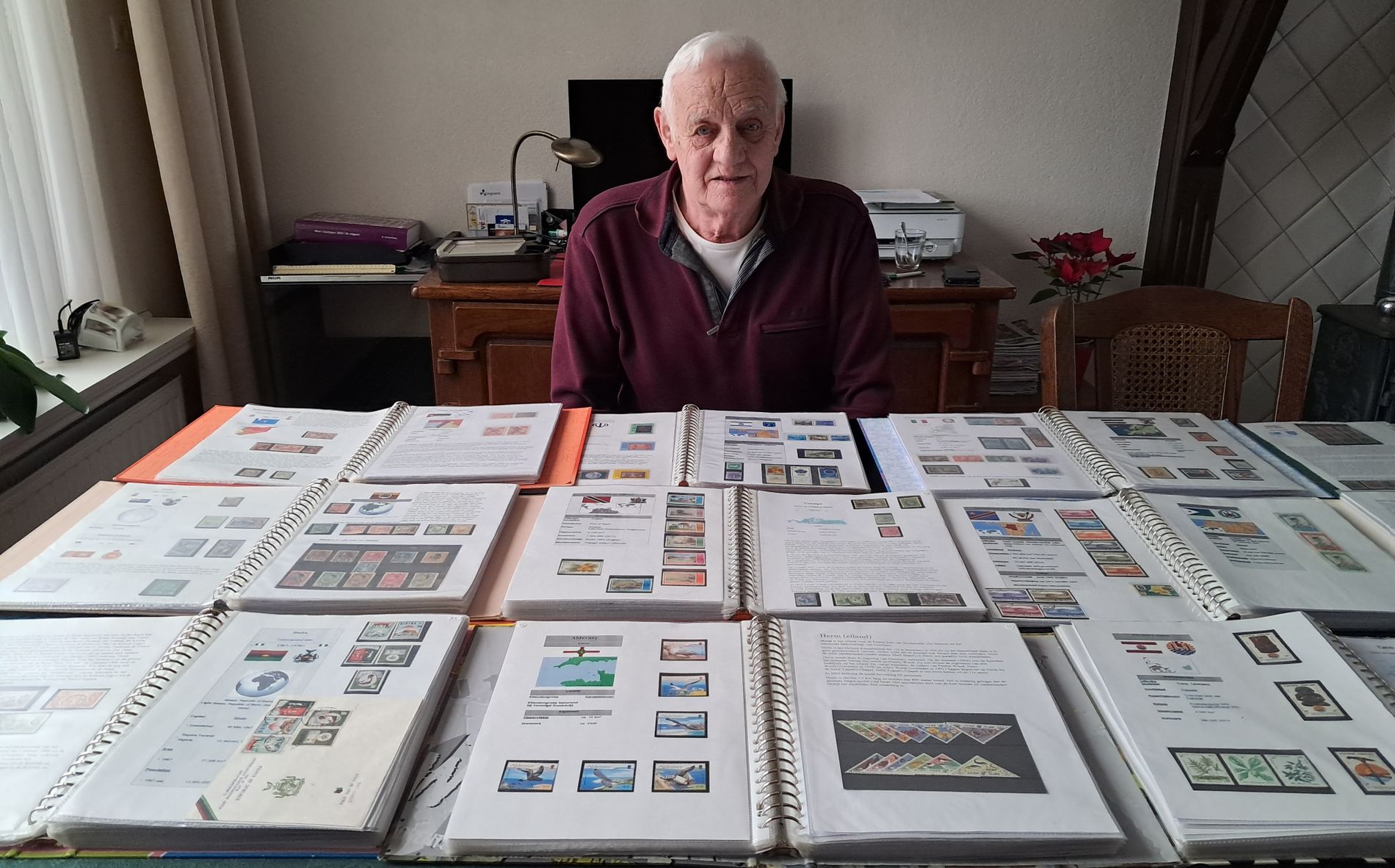 Al zolang als hij zich kan herinneren verzamelt Jan Kuijpers uit Sint Oedenrode postzegels. In eerste instantie waren dat alle postzegels uit alle landen. Maar dat werd teveel. Ongeveer 26 jaar geleden is hij begonnen zich te specialiseren. Vooral in de winter kan hij uren bezig zijn met zijn verzameling. Hij maakt nu van ieder land een informatieblad en zet daar enkele post-zegels bij. Op dit moment zijn er 193 erkende landen en van ieder land heeft hij een pagina gemaakt met onder andere waar het ligt, de hoofdstad, de taal die er gesproken wordt, de rege-ringsvorm, de oppervlakte en het inwonertal. Daarbij plakt hij dan een aantal klemstroken met postzegels van dat land. In eerste instantie maakte het hem niet uit wat voor postzegels het waren: oud of nieuw, losse of series.