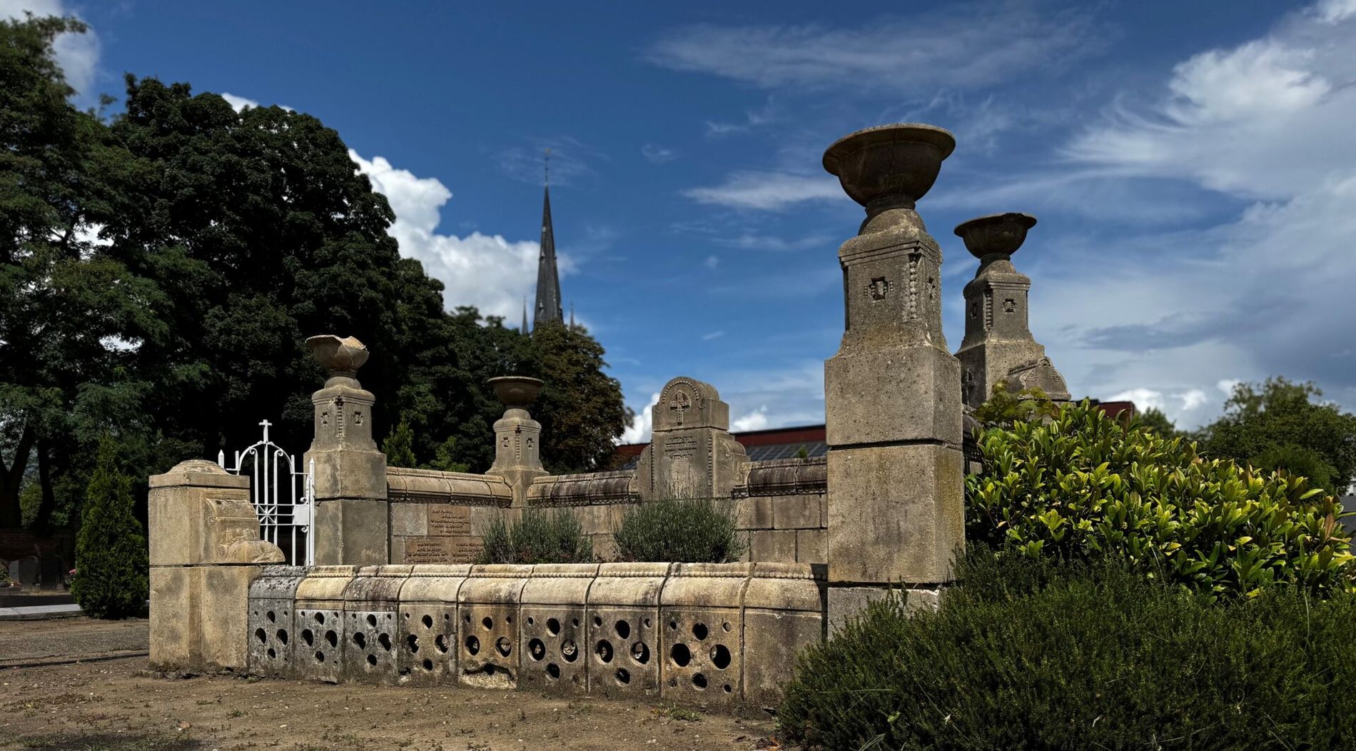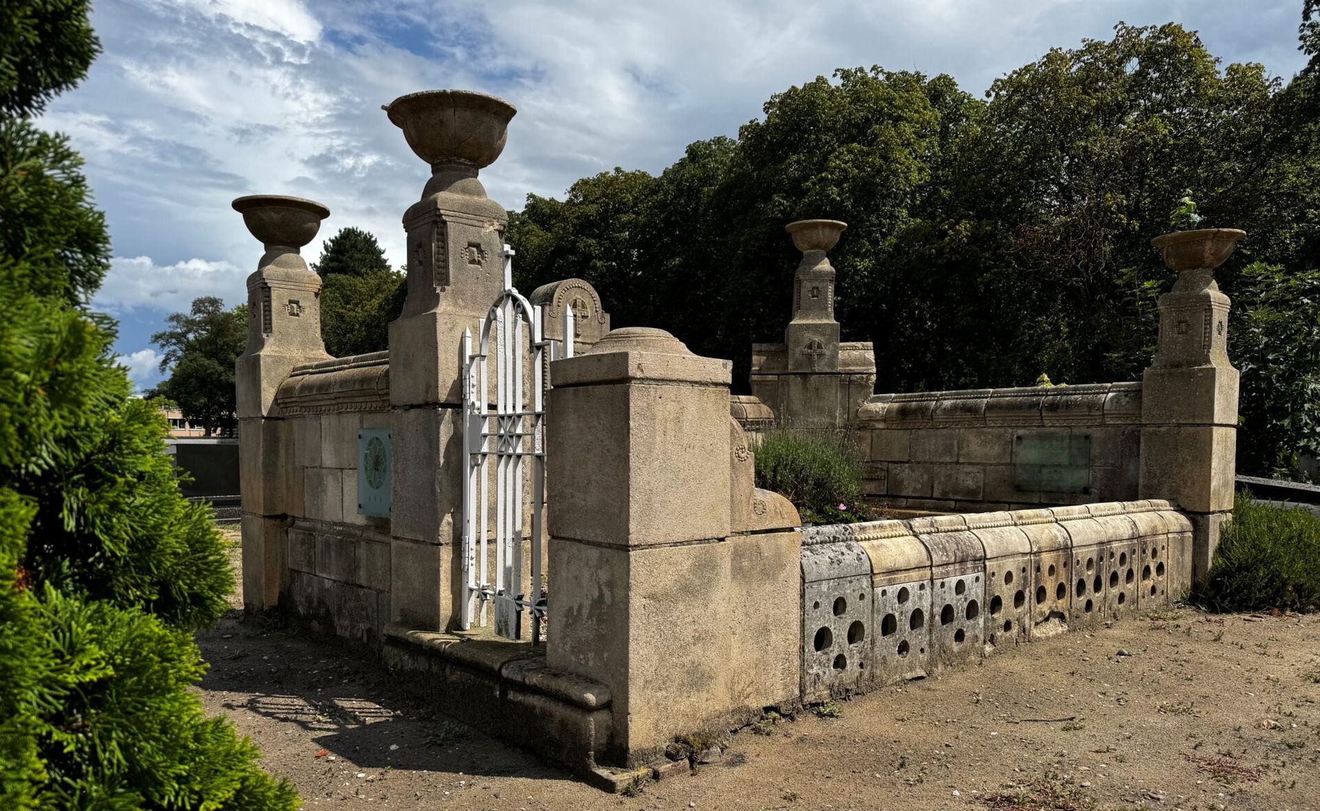 In de linkermuur is aan de voorzijde een smeedijzeren poortje tussen pijlers aangebracht. Tegen de binnenzijde van deze muur zijn in drie blokken zandsteen opschriften in reliëf gemaakt: