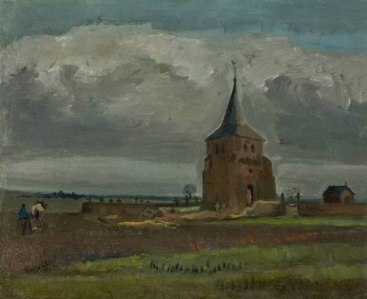 In het schilderij De oude kerktoren te Nuenen, dat hij zelf ‘Cimetière de paysans’ noemt, ziet hij de half afgebroken toren als symbool voor de vergankelijkheid van het geloof. Terwijl in contrast daarmee ‘sedert eeuwen de boeren ter ruste worden gelegd in de akkers zelve, welke zij bij hun leven doorwroeten' en daarmee hun leven in zijn ogen onveranderlijk is. Op het kerkhof bij de toren worden in het noordelijke deel de katholieken en in het zuidelijke deel de protestanten begraven. Het lijkenhuisje naast de toren is in menig werk van Vincent te herkennen.