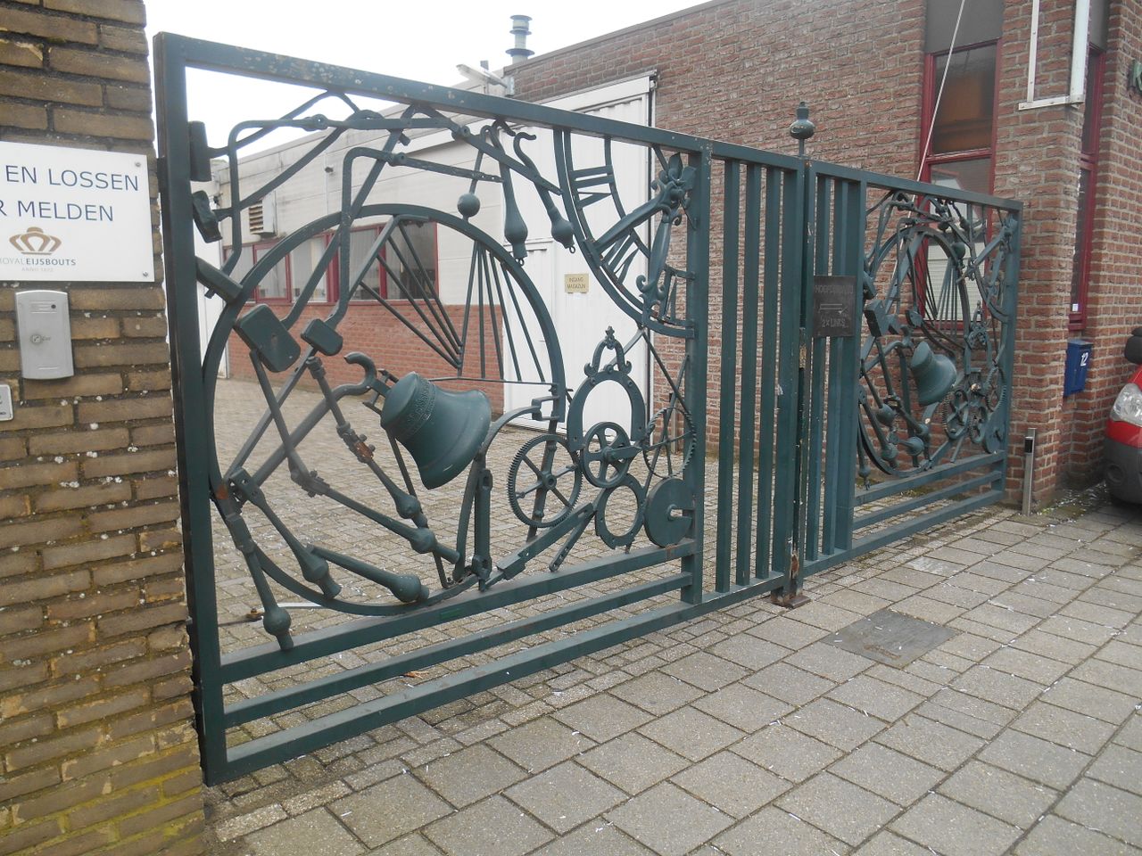 Mathieu Konings ontwierp dit hekwerk in 1972 uit restmateriaal van klokken en uurwerken. Een vergelijkbaar ontwerp is te vinden bij Museum Klok & Peel.
